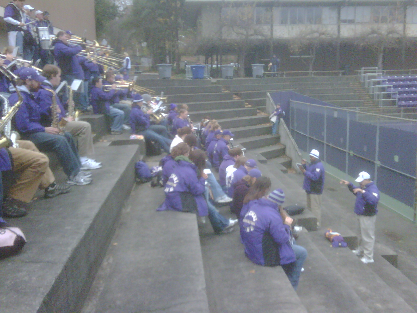 During the game itself, the routine continues. We play a few tunes during some of the time-outs. Our turn to play is all coordinated with the UW Varsity Band via headsets. Then, after the Varsity Band concludes its half-time show, we play a few tunes from the track in front of the main southside grandstand until the teams return and the second half begins. Next, after the game ends, we play a few tunes in front of the people in the “horseshoe” stands at the west end, where we always sit during the games. Our last song there last night was “Celebration.” People in the stands sang along and swayed to music…it’s great to relish a victory.