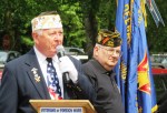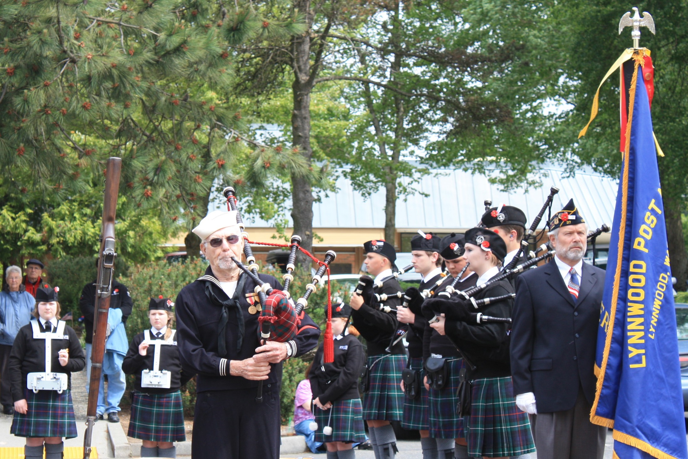 Martin Spani, Commander of Post 1040 of the Veterans of Foreign Wars (VFW), Lynnwood, emceed the ceremony which featured the Northwest Junior Pipe Band, singer Garret Lloyd King, and guest speaker, Lt. Col. Joseph S. Jimenez, U.S. Army (Ret.). The memorial wreaths were laid by Richard Larson, USN, WWII, of Lynnwood American Legion Post 37, and Art Clemente, USMC, WWII, Lynnwood VFW Post 1040. Boy Scouts of America, Lynnwood Troup 49, assisted by placing the flags in the park and distributing the programs. A crowd of almost 225 attended under an overcast sky.