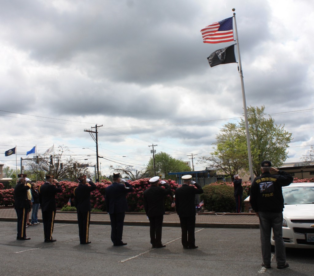 Honor Guard, VFW Post 1040, Lynnwood, renders salute as American flag is hoisted to full-mast and “To the Color” is sounded by the post bugler at noon. (by Chaplain Mary Sjoberg)