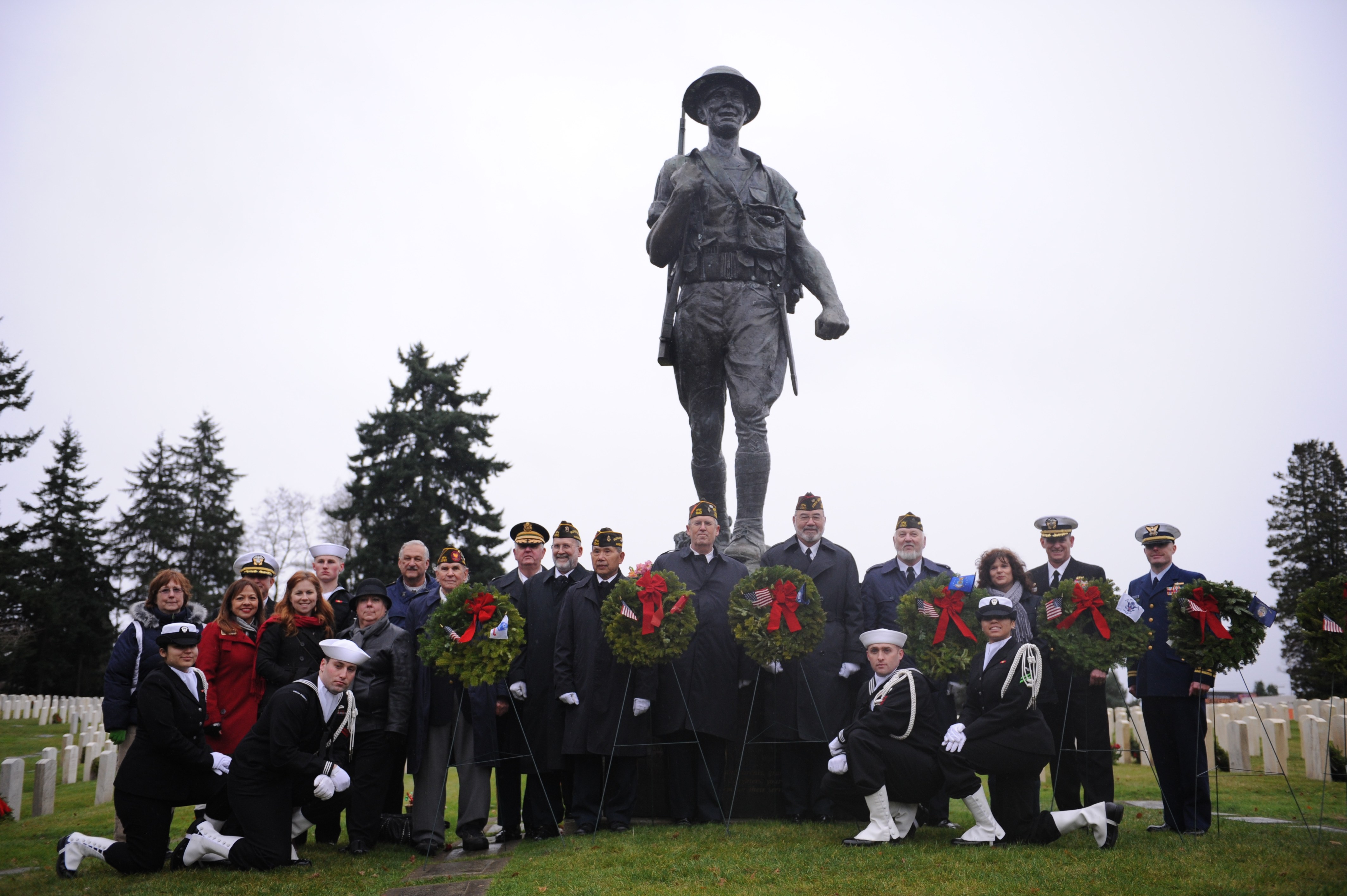 Color Guard, Honor Guard, organizers and volunteers, WAA, beneath WWI Doughboy Statue, Veterans Memorial Cemetery, Seattle, 12-15-’12. Photo by Nathan Bradshaw, PA3, USCG