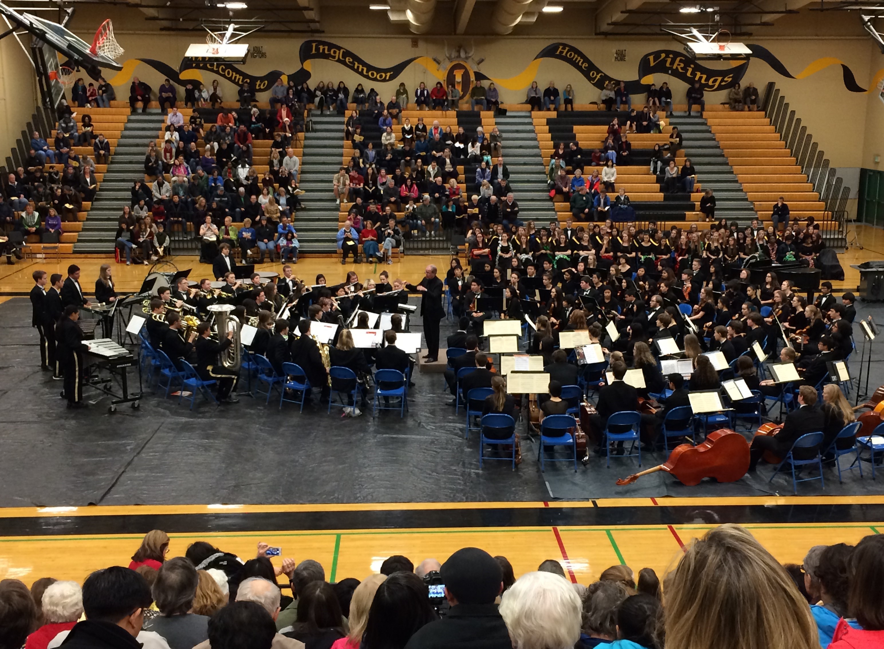 This year’s “Winter Holiday Concert” at Inglemoor High School’s (IHS’s) Performing Arts Gymnasium in Kenmore on 18 December 2014, started with about 30 minutes of music by the school’s jazz band, as the full-house audience arrived and got seated in the grandstands. They played Bernard’s “Winter Wonderland,” among other tunes. Mr. Jim Rice is the Jazz Band Director, and he also conducted the Symphonic Band (including “Themes from ‘The Nutcracker'”) and String Orchestra (Holtz’s “In the Bleak Midwinter”).