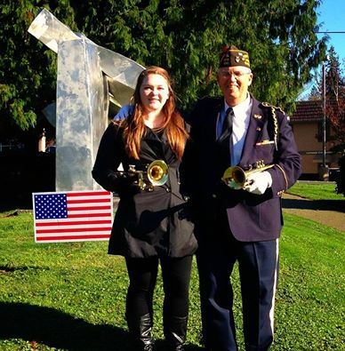 As VFW Post 1040 bugler, I sounded three bugle calls: “Assembly” to call the people to order to commence the ceremony, “Echo Taps” to conclude the ceremony, and afterwards at noon, “To the Color,” to raise the flag from half-staff to full-mast. In playing “Echo Taps,” I was joined by a trumpet student of mine from Juanita High School in Kirkland. Please click on the photo to enlarge it.