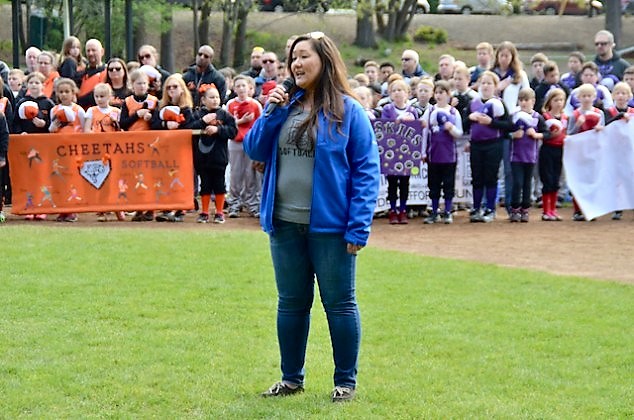 “To the Color” on Pacific Little League Day, 21 April, at Lynndale Park in Lynnwood » DSC_0775[1] – Nikki Glaros of Edmonds, singing the National Anthem