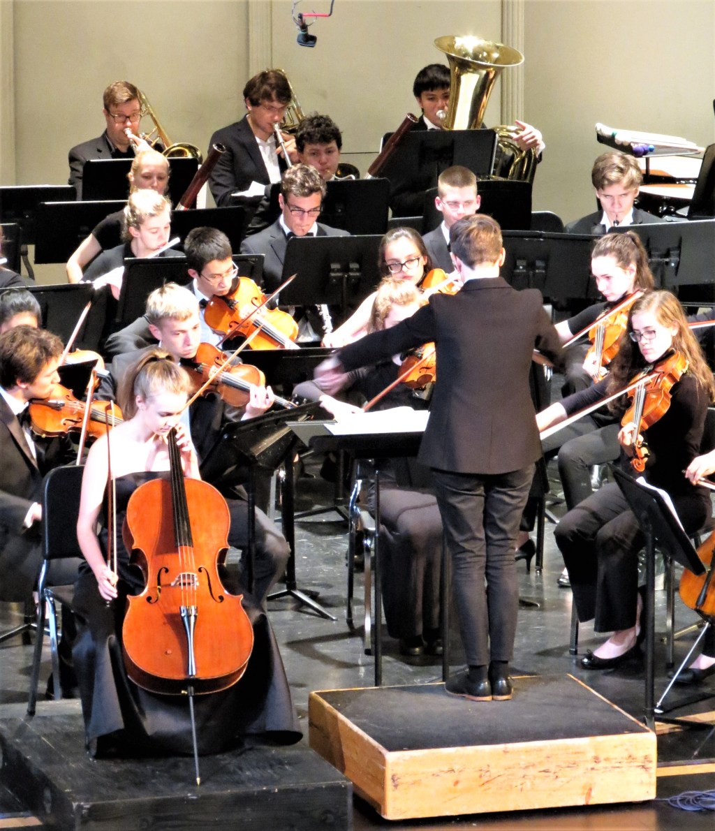 Zofia Sabee, cellist, Kim Roy, conductor, and Ben Laverde, tubist, Garfield Symphony Orchestra, 13 June 2018