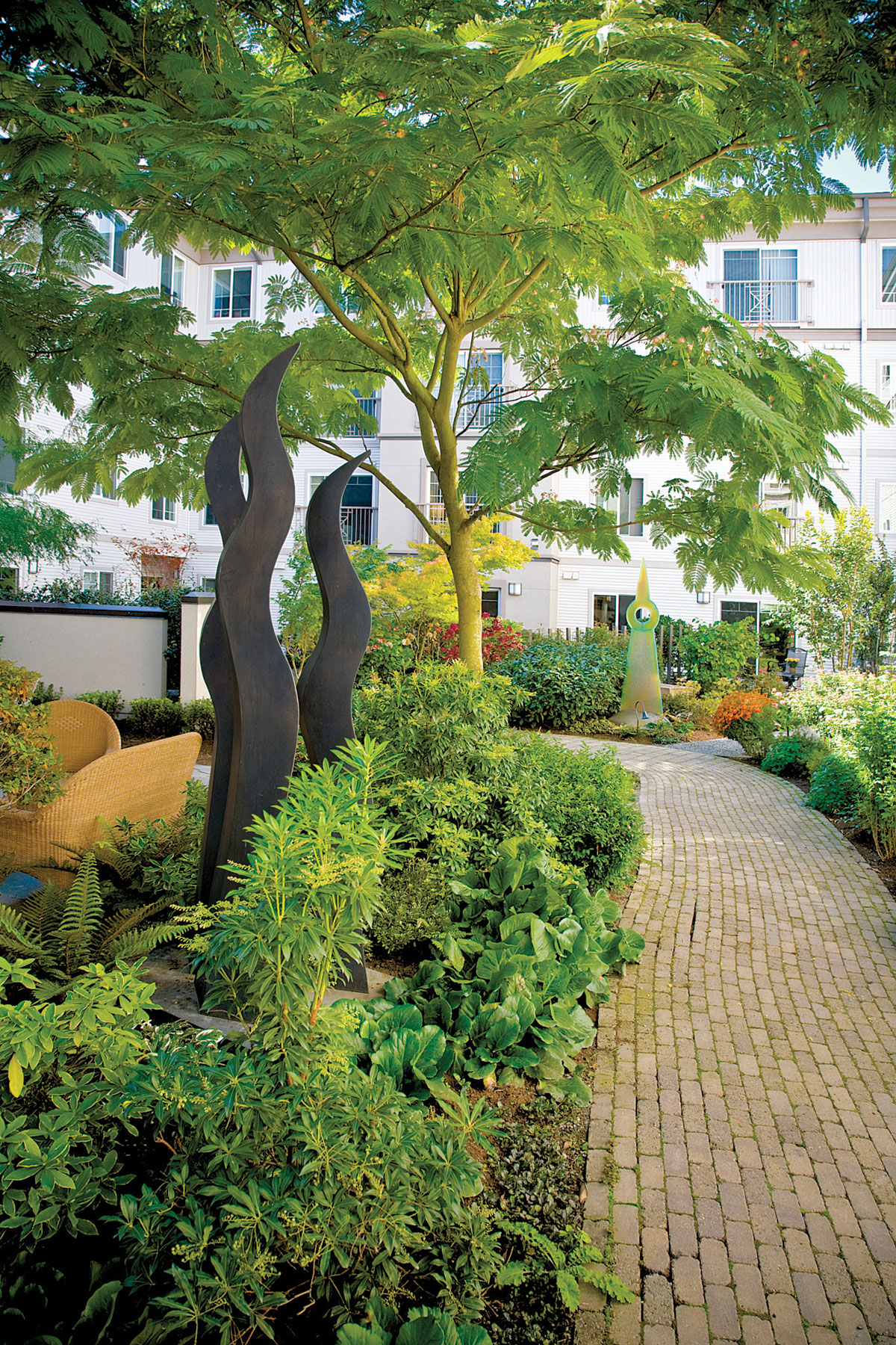 St. Patrick’s Day Celebration—My Trumpet Show at University House, Issaquah » University-House-Issaquah-senior-living-outdoor-garden-walkway-with-art-Era-Living[1]