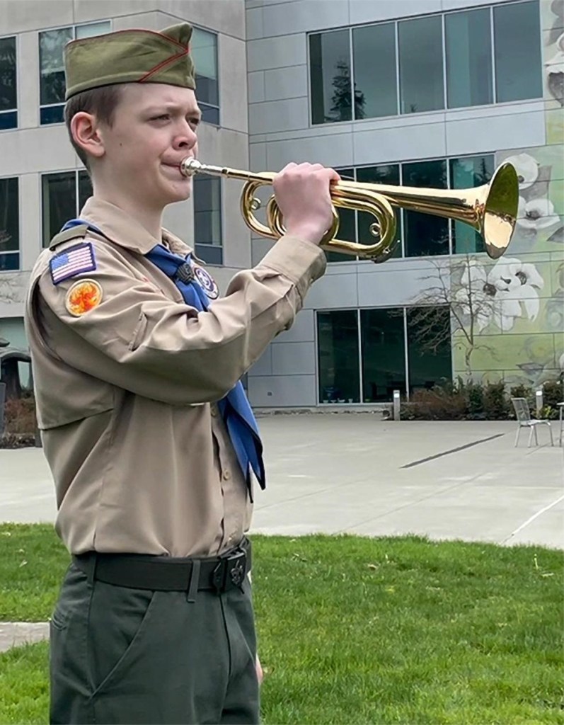 Who would join me, as VFW Post 1040 Bugler, and sound the “Echo” part of “Taps”? The same Boy Scout from Troop 312 in Edmonds who did it with me at this same place on Independence Day last year (please see my previous post of 29 July 2020). This year, however, he played the “Echo” on his Getzen bugle, not his trumpet. And thereby hangs a tale.