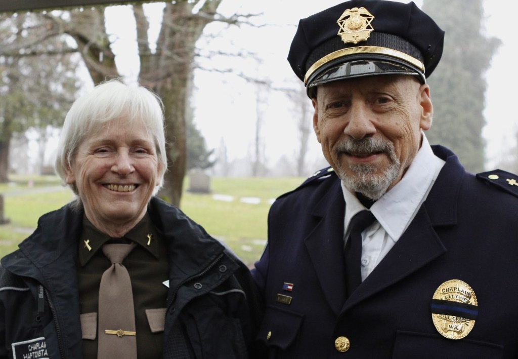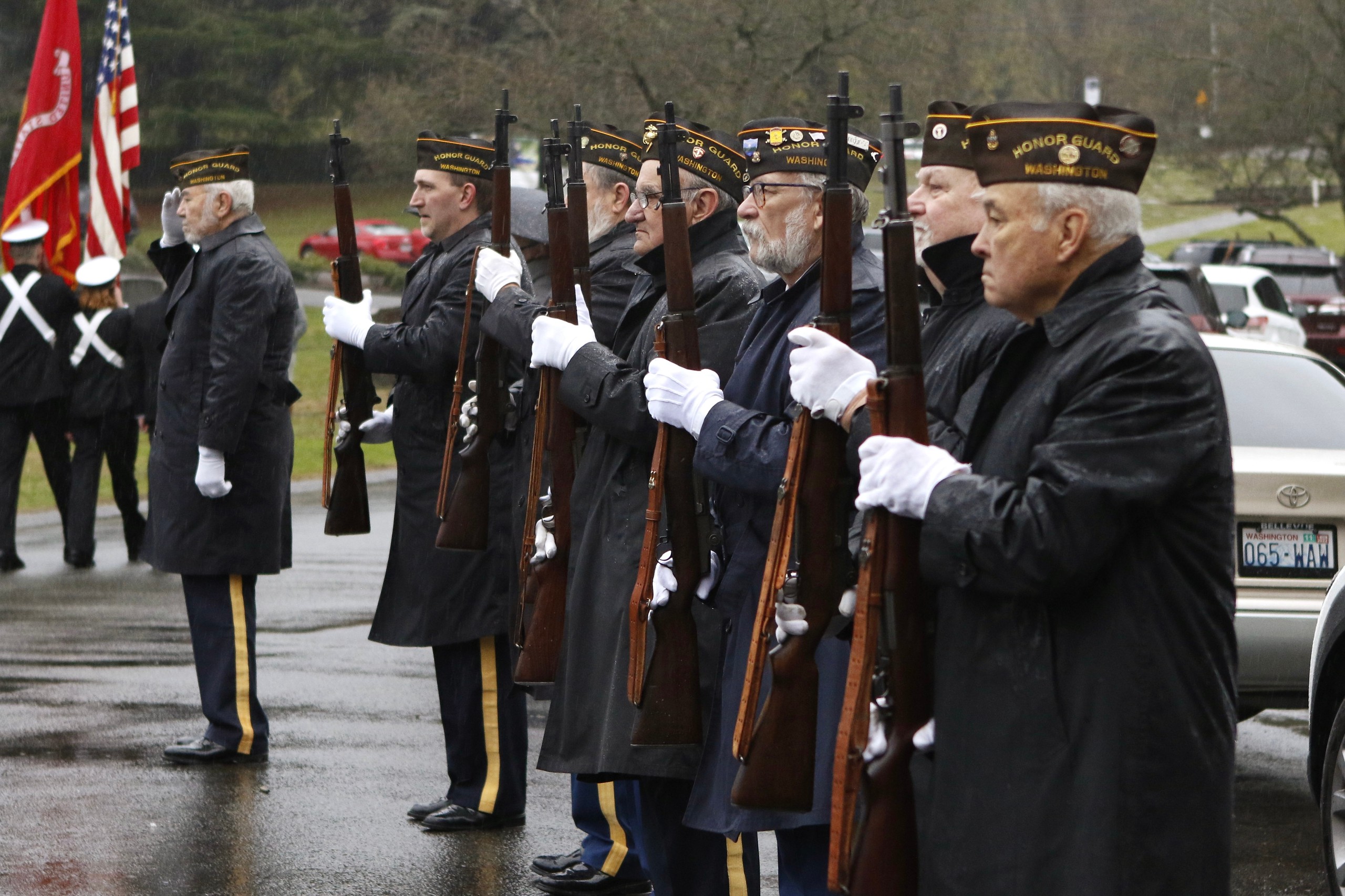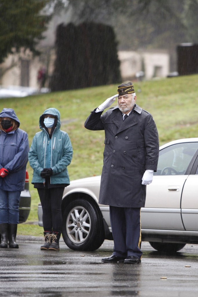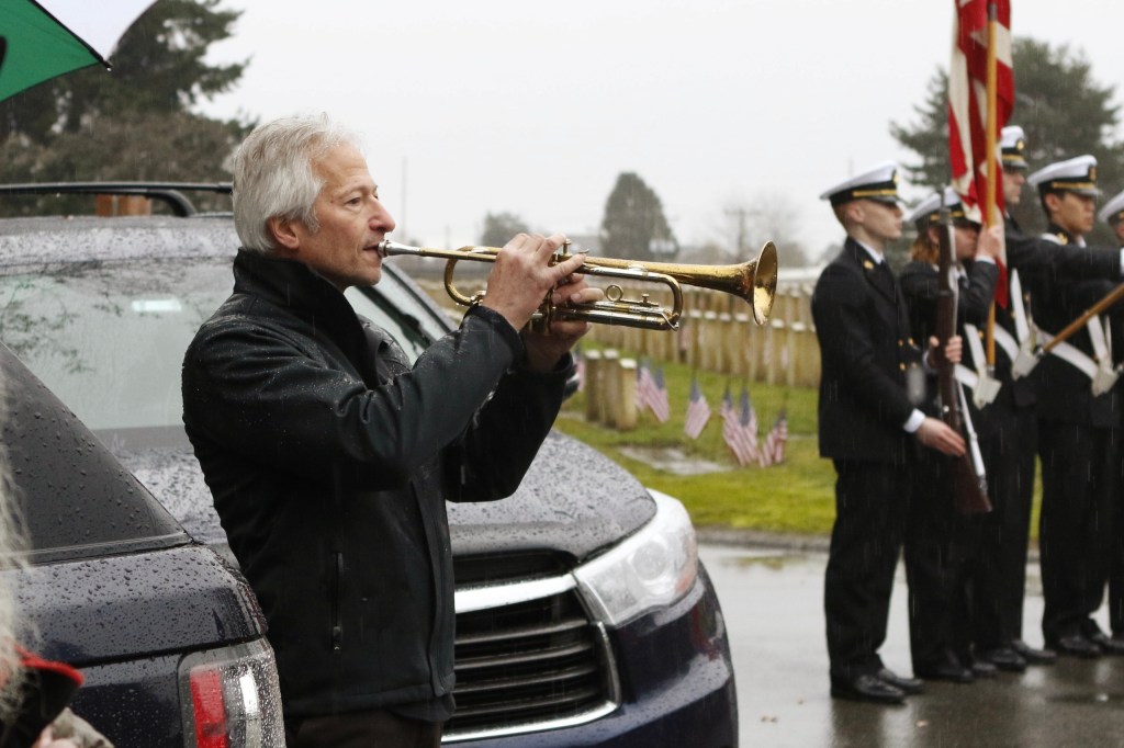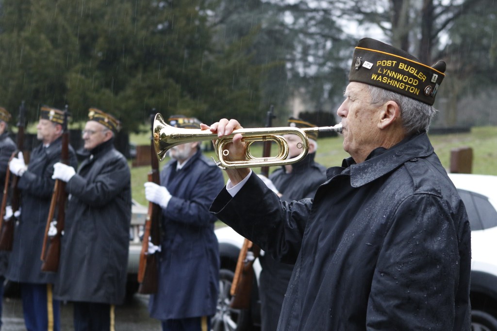 The third Saturday of December was the 18th, and that could mean only one thing to a bugler—it was time for the annual Christmas wreath-laying ceremony, Wreaths Across America (WAA). Never mind that it was raining steadily. At 9 a.m., the President and Executive Director of the Veterans Memorial Wreath Foundation, Lorraine Zimmerman, announced over the loud speaker, “Bugler, sound ‘Assembly!'” And so I did for the 11th time. Then the Color Guard of the Navy ROTC program at the University of Washington presented the colors, and the crowd of about 200 patriots pledged allegiance to the flag. Chaplain Linda Haptonstall gave the invocation.