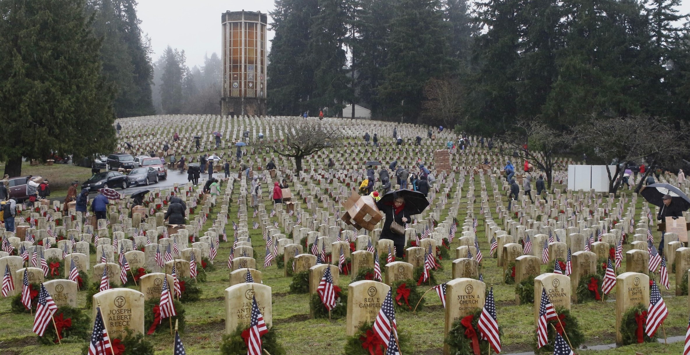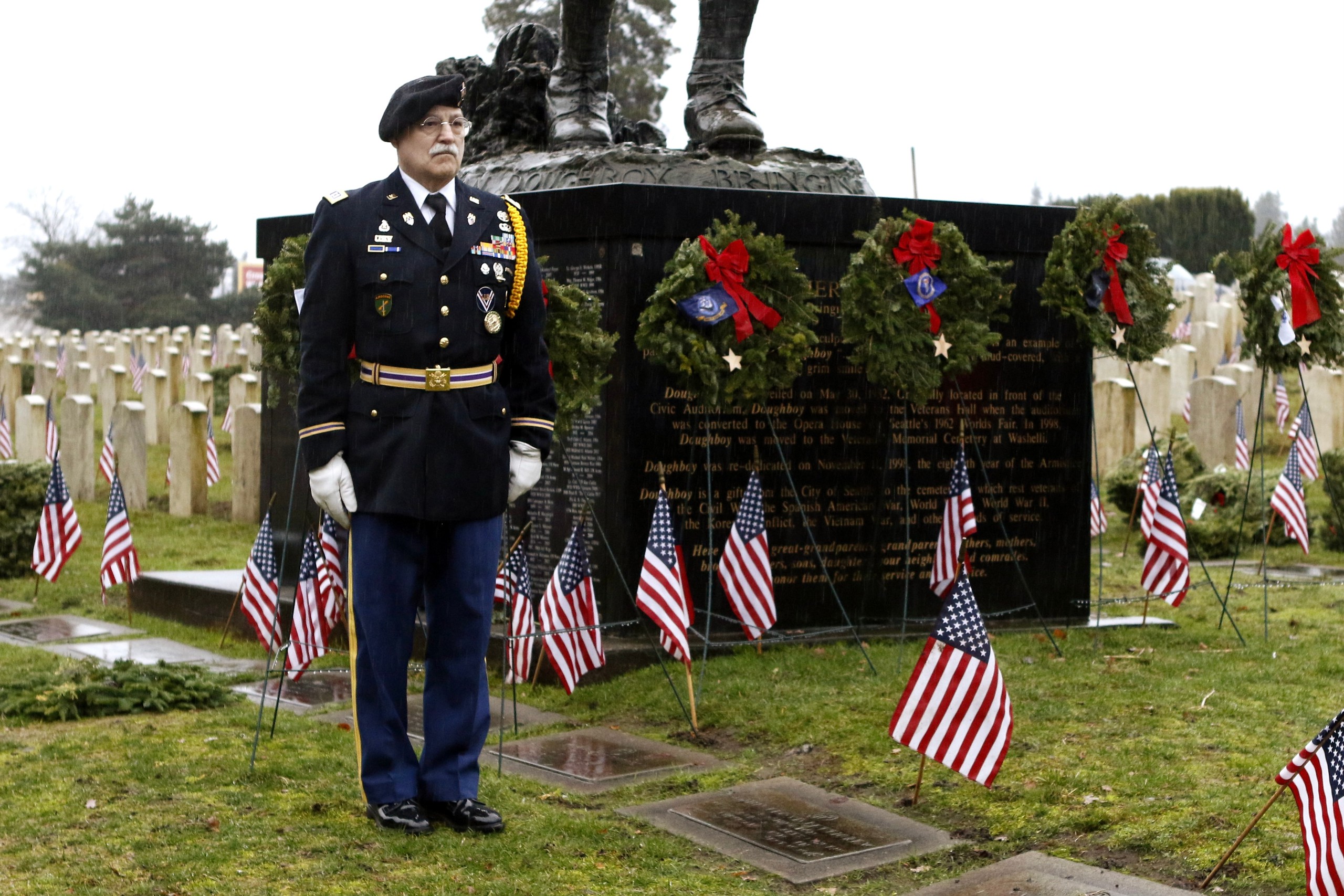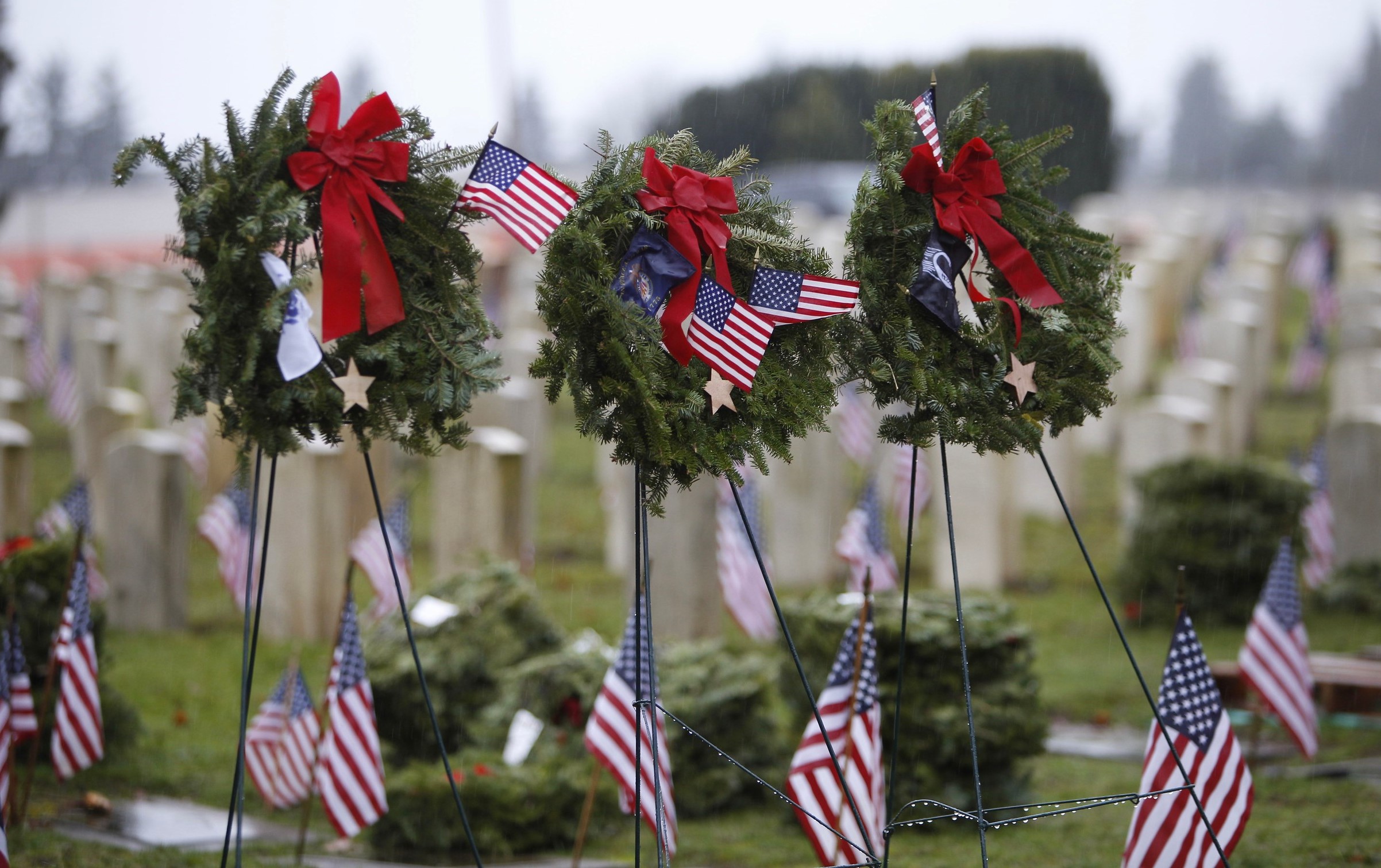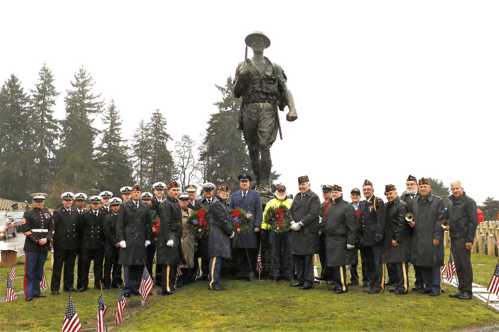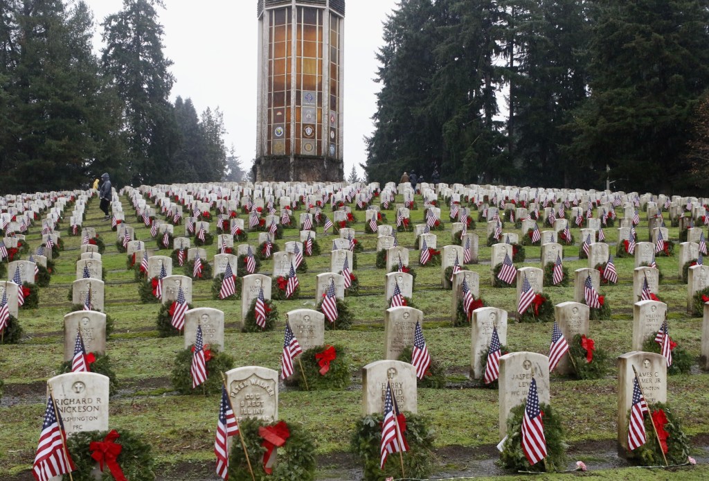 But the local event was not over—there was more to be done. The crowd voluntarily began laying 3,000 wreaths on the gravestones in the Veterans Memorial Park at Evergreen-Washelli Cemetery in north Seattle. VMWF has the ambitious goal of adorning all 5,000 veterans’ gravestones someday. To do that, more sponsors are needed. A donation of $15 sponsors one wreath; two, $30; five, $75 (most popular); ten, $150.