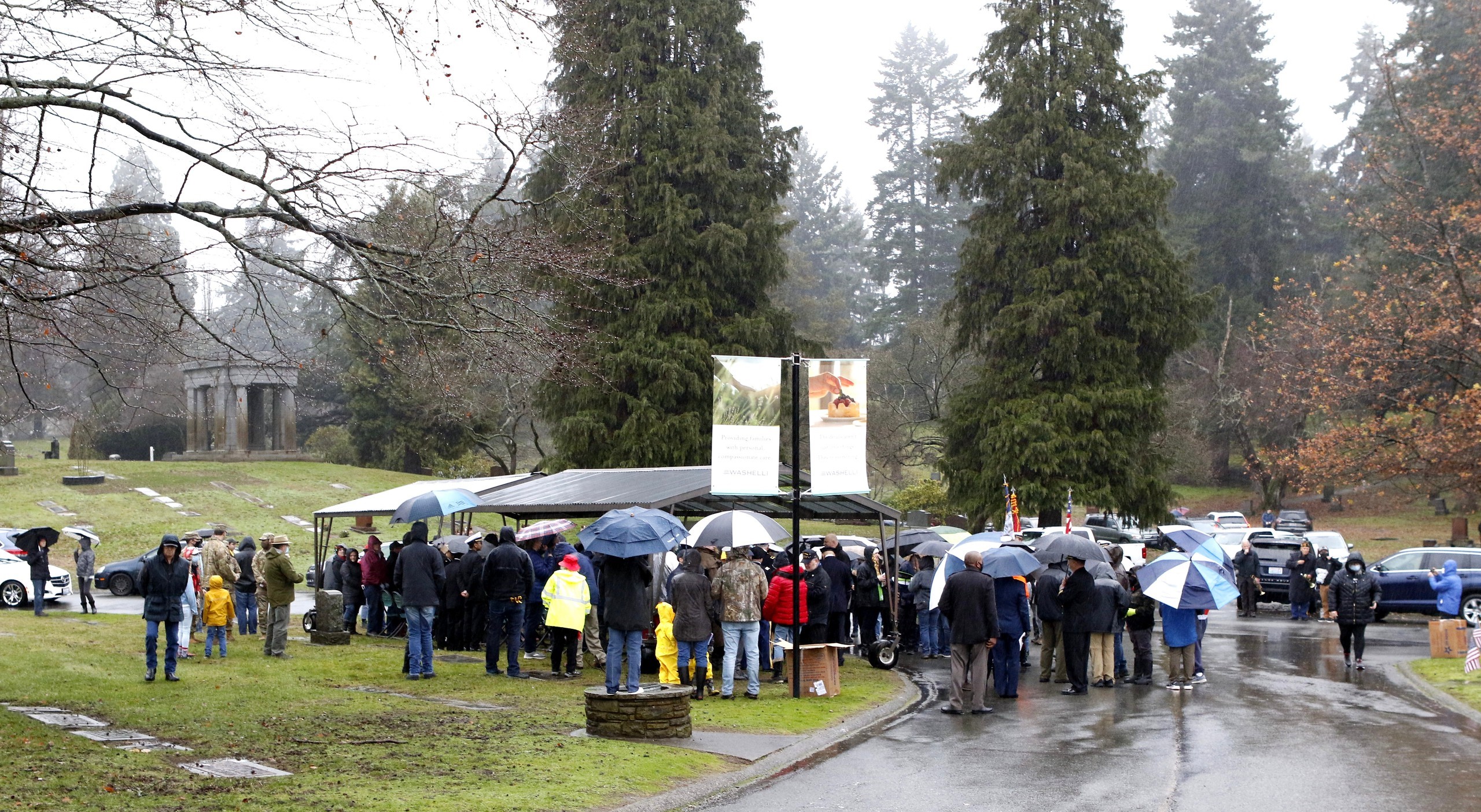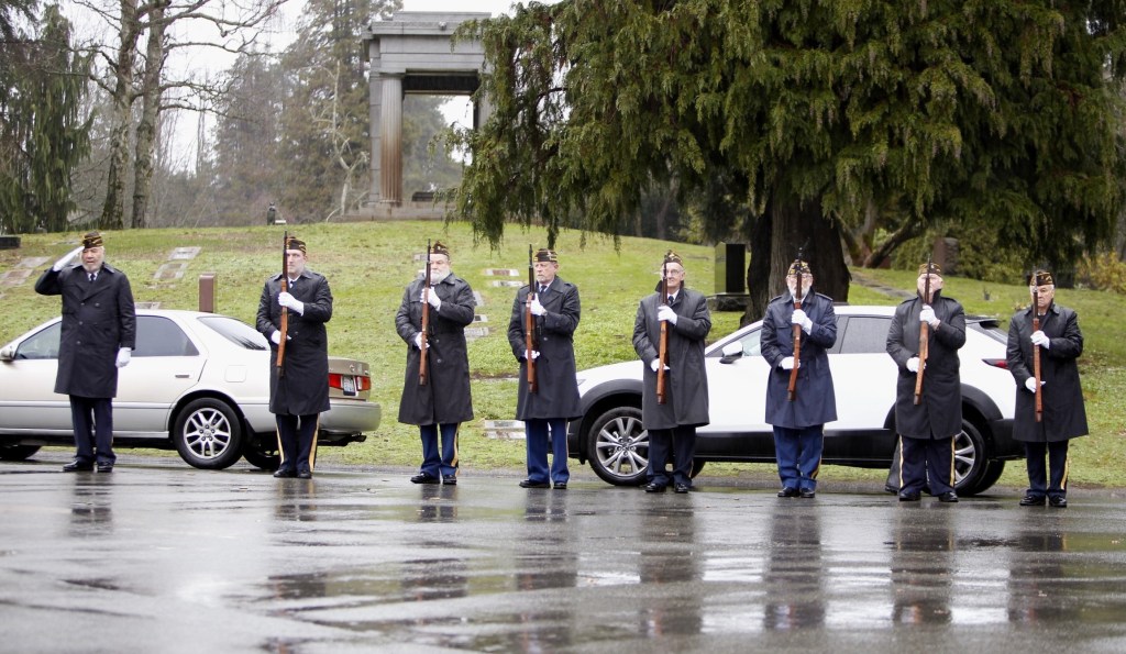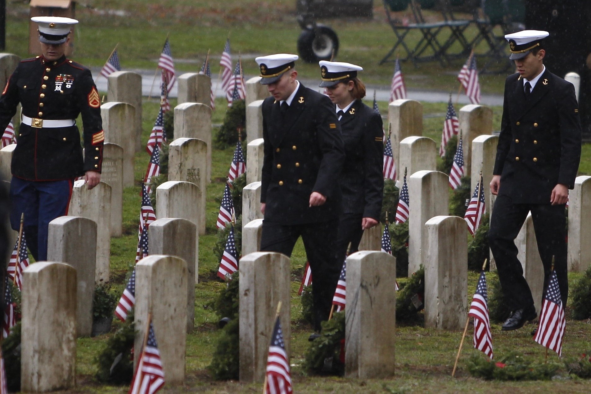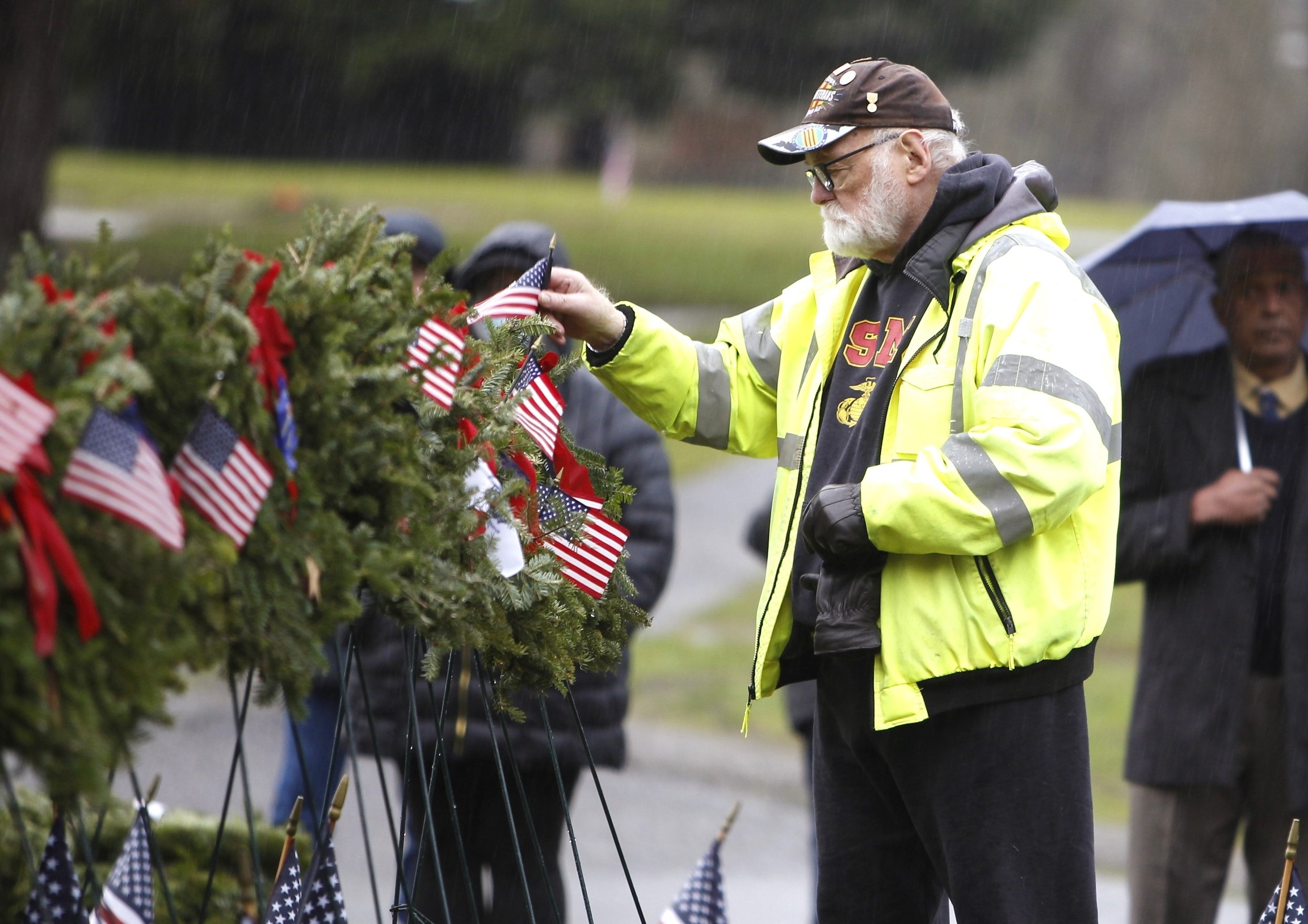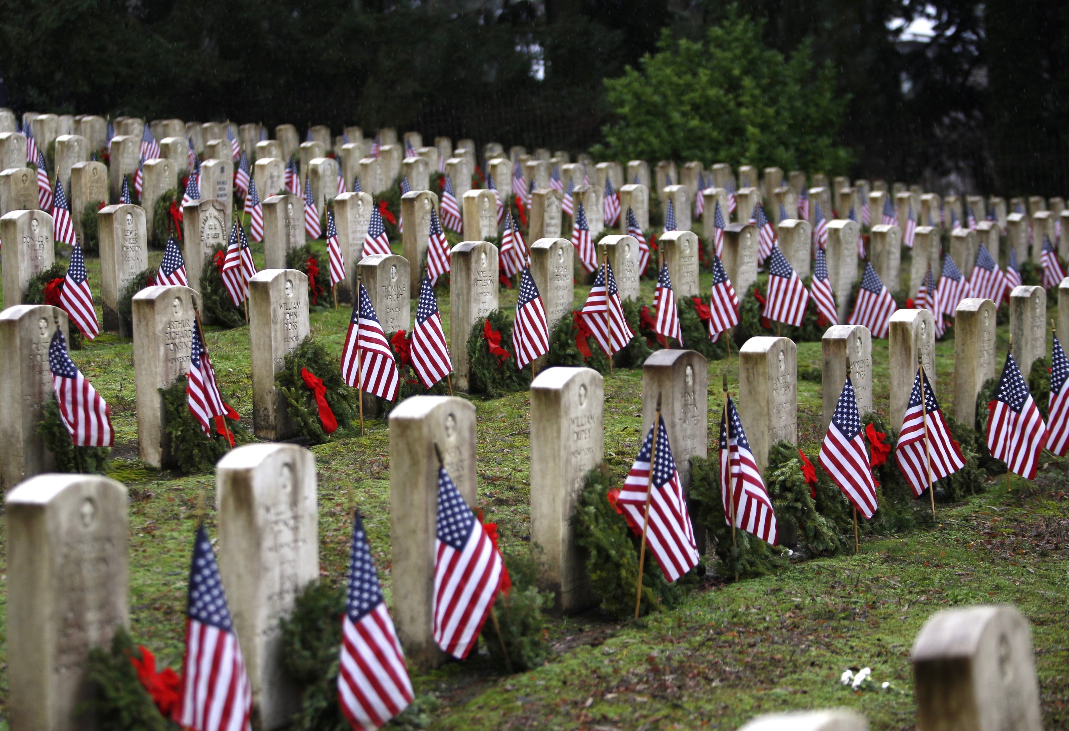But the local event was not over—there was more to be done. The crowd voluntarily began laying 3,000 wreaths on the gravestones in the Veterans Memorial Park at Evergreen-Washelli Cemetery in north Seattle. VMWF has the ambitious goal of adorning all 5,000 veterans’ gravestones someday. To do that, more sponsors are needed. A donation of $15 sponsors one wreath; two, $30; five, $75 (most popular); ten, $150.