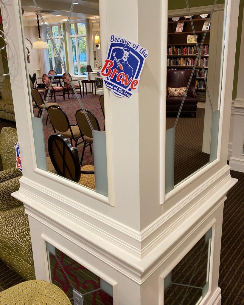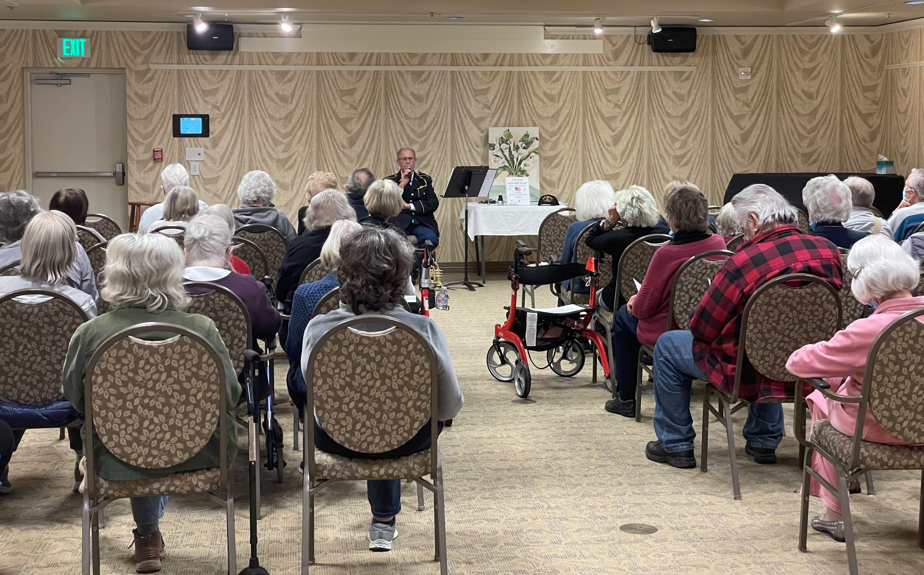 At about 9:15 came the main program segment, the Ceremonial Wreath Dedication. One by one, eight men placed and saluted small flags on eight wreaths in memory of and gratitude for those who have fallen in service to America. After the benediction, the Honor Guard of VFW Post 1040 of Lynnwood fired a three-volley rifle salute, immediately followed by “Echo Taps,” sounded by me and Laurence Stusser. He used his Olds trumpet, and I used my Getzen bugle. The colors were retired, and after the benediction by the Chaplin, this 13th annual ceremony concluded. Similar ceremonies were held at more than 3,100 locations nationwide on this day.