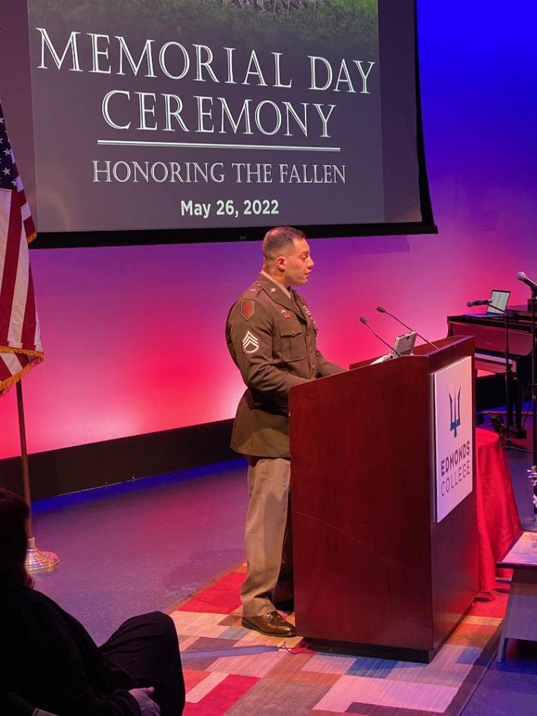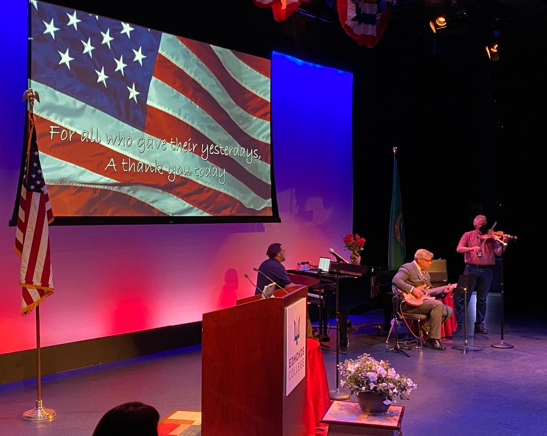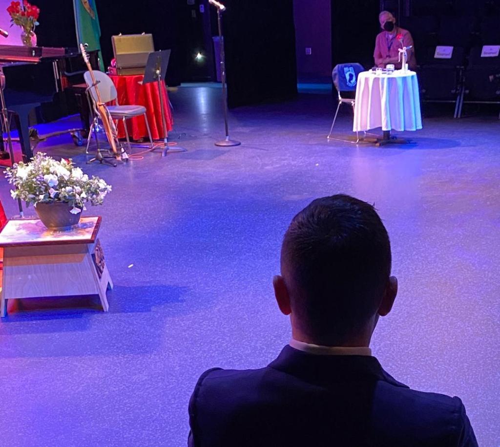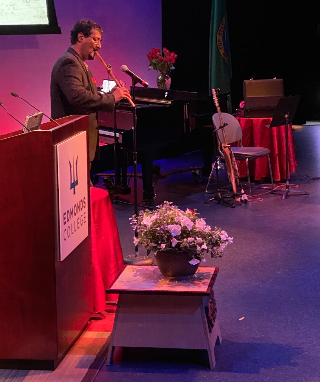 At the ceremony at ECC, dressed in my VFW uniform, I sounded two bugle calls: “To the Color” inside the Black Box Theatre and “Taps” outside near the Boots to Books and Beyond monument. Native American Peter Ali improvised solos on two of his flutes twice during the ceremony.