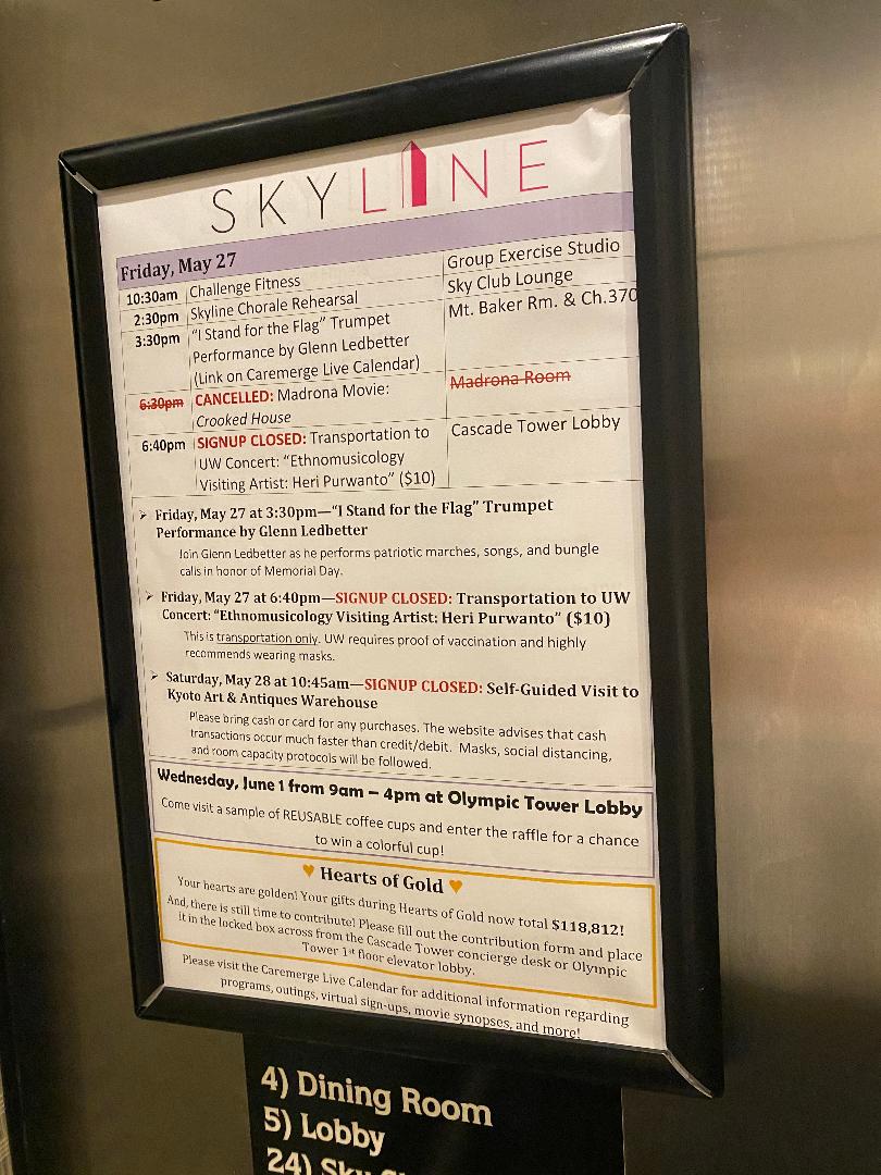 At Skyline Towers retirement community in downtown Seattle, I performed my one-hour trumpet show, “I Stand for the Flag,” again in uniform. It is a collection of about two dozen patriotic marches, songs, and bugle calls. I did the same show at The Bellettini in downtown Bellevue and at Fairwinds Redmond.