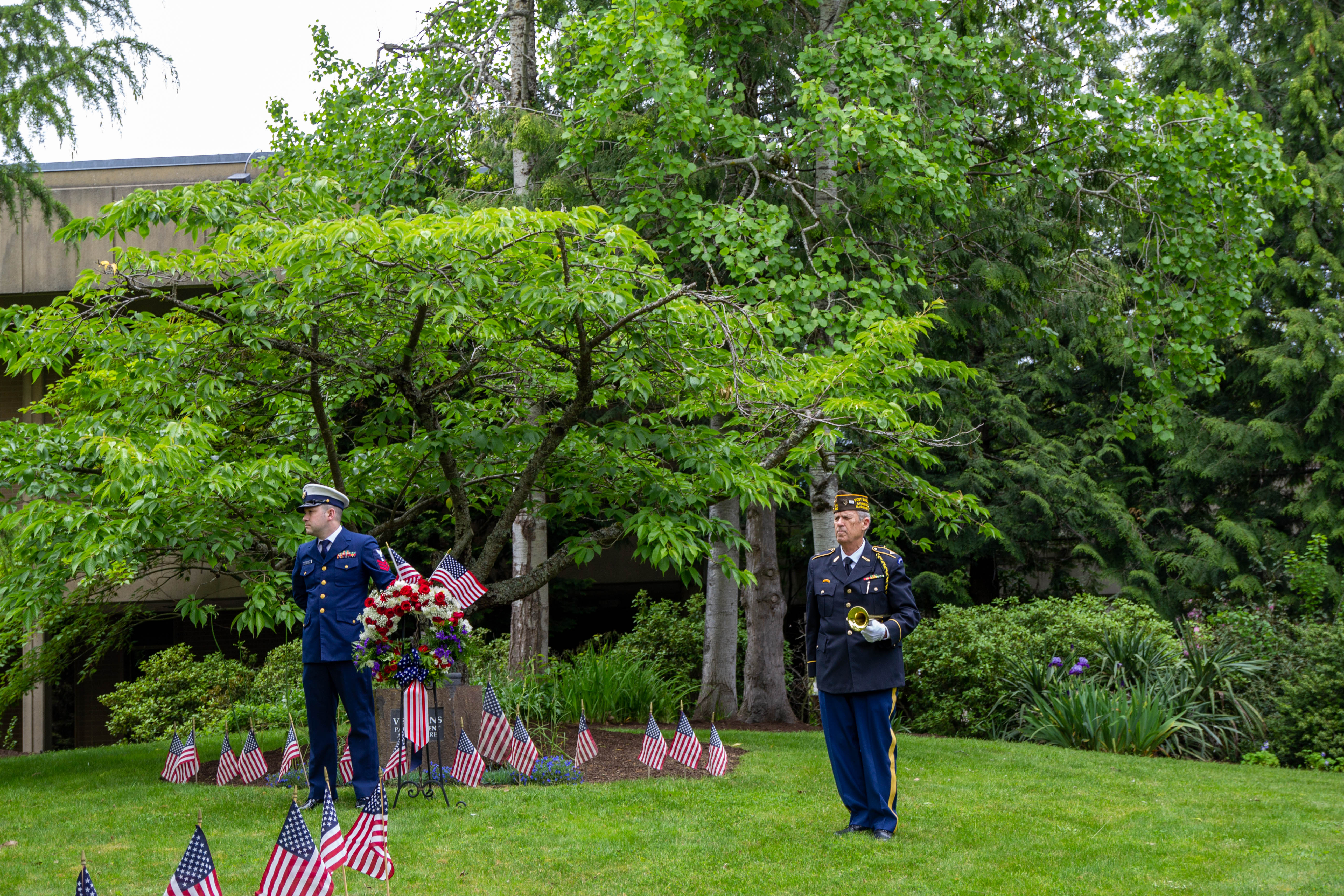 But before performing in the afternoon in Redmond on Memorial Day, I also sounded three bugle calls in the morning at Veterans Park in Lynnwood: “Assembly,” “Echo Taps,” and “To the Color.” Lukas Breen sounded the echo part in “Echo Taps.” He is an Electrician’s Mate 2nd Class on active duty in the U.S. Coast Guard, stationed in Everett. We both play Getzen bugles. Other musicians were a piper and drummer from the Northwest Junior Pipe Band, playing “Scotland the Brave,” “The Rowan Tree,” “Battle’s O’er,” “Amazing Grace,” and “Going Home.”