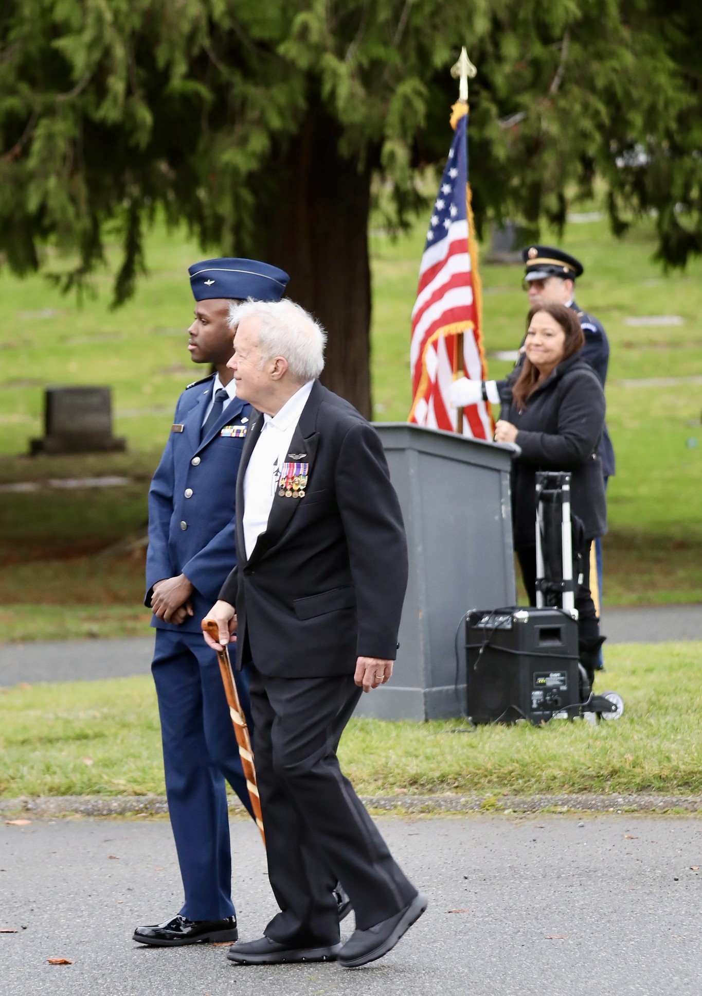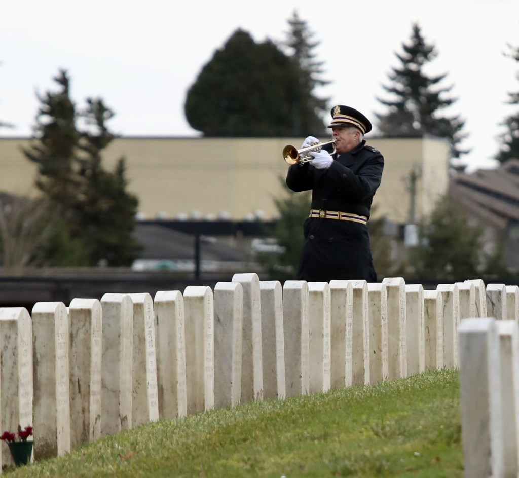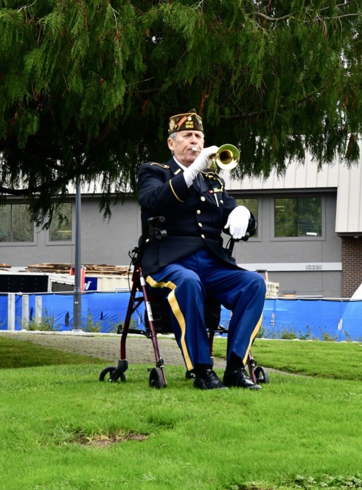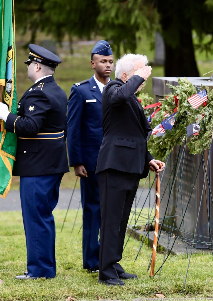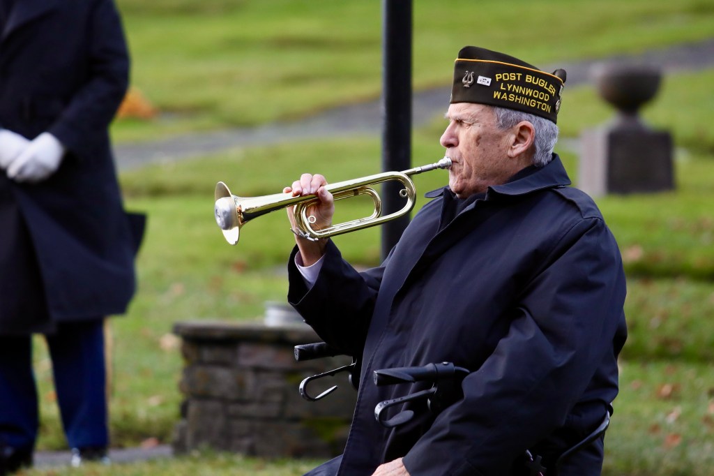 My bugle call, “Assembly,” called the ceremony to order. The first major event, as always, was the placement of flags upon the 8 ceremonial wreaths by representatives of the Army, Marine Corps, Navy, Air Force, Space Force, Coast Guard, Merchant Marines and POWs/MIAs. (Read more about the POW/MIA representative below.) Then the Honor Guard of VFW Post 1040 of Lynnwood fired a 21-gun salute (3 volleys).