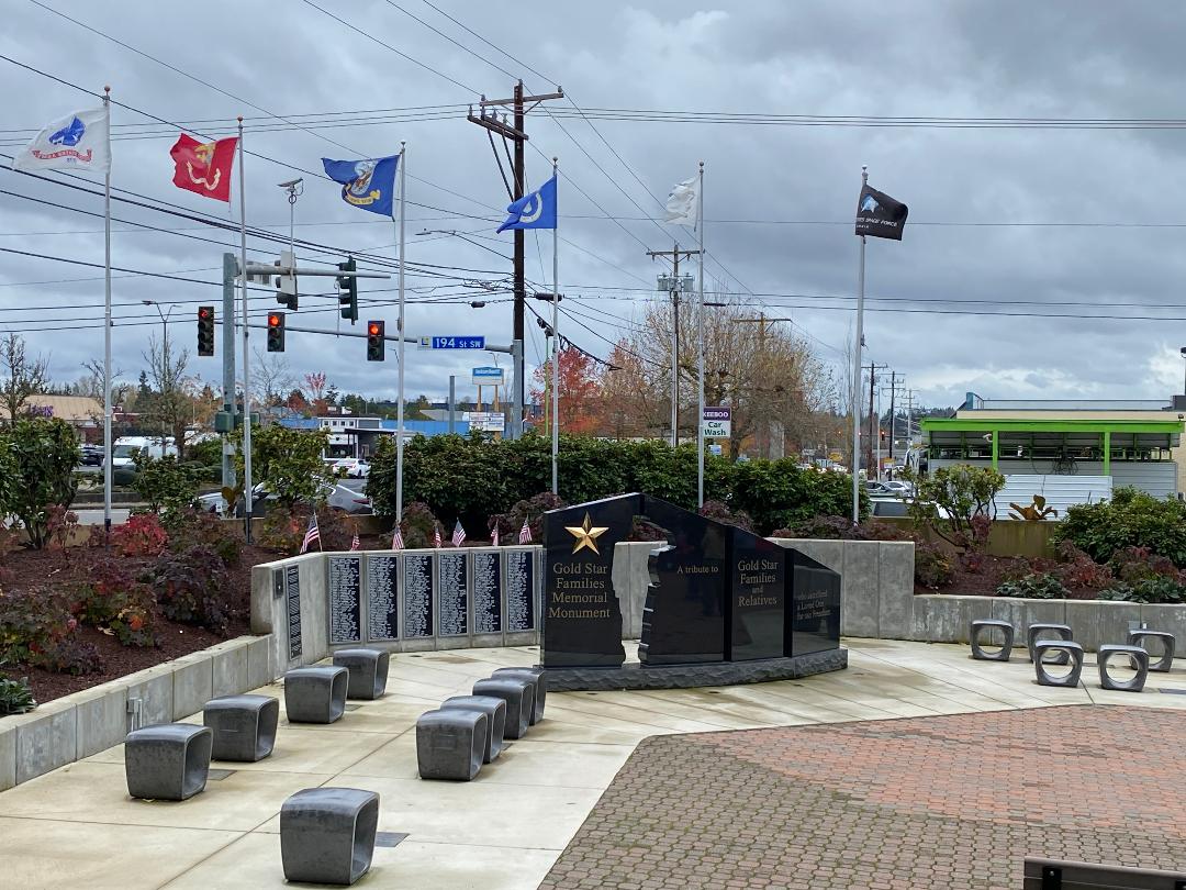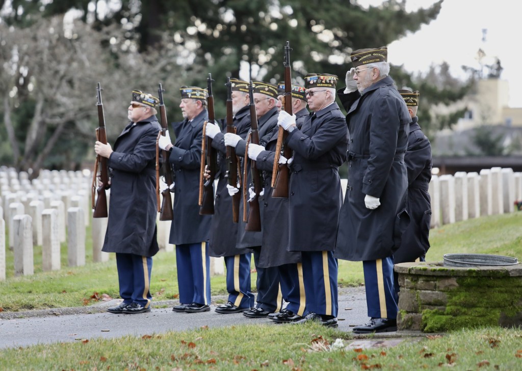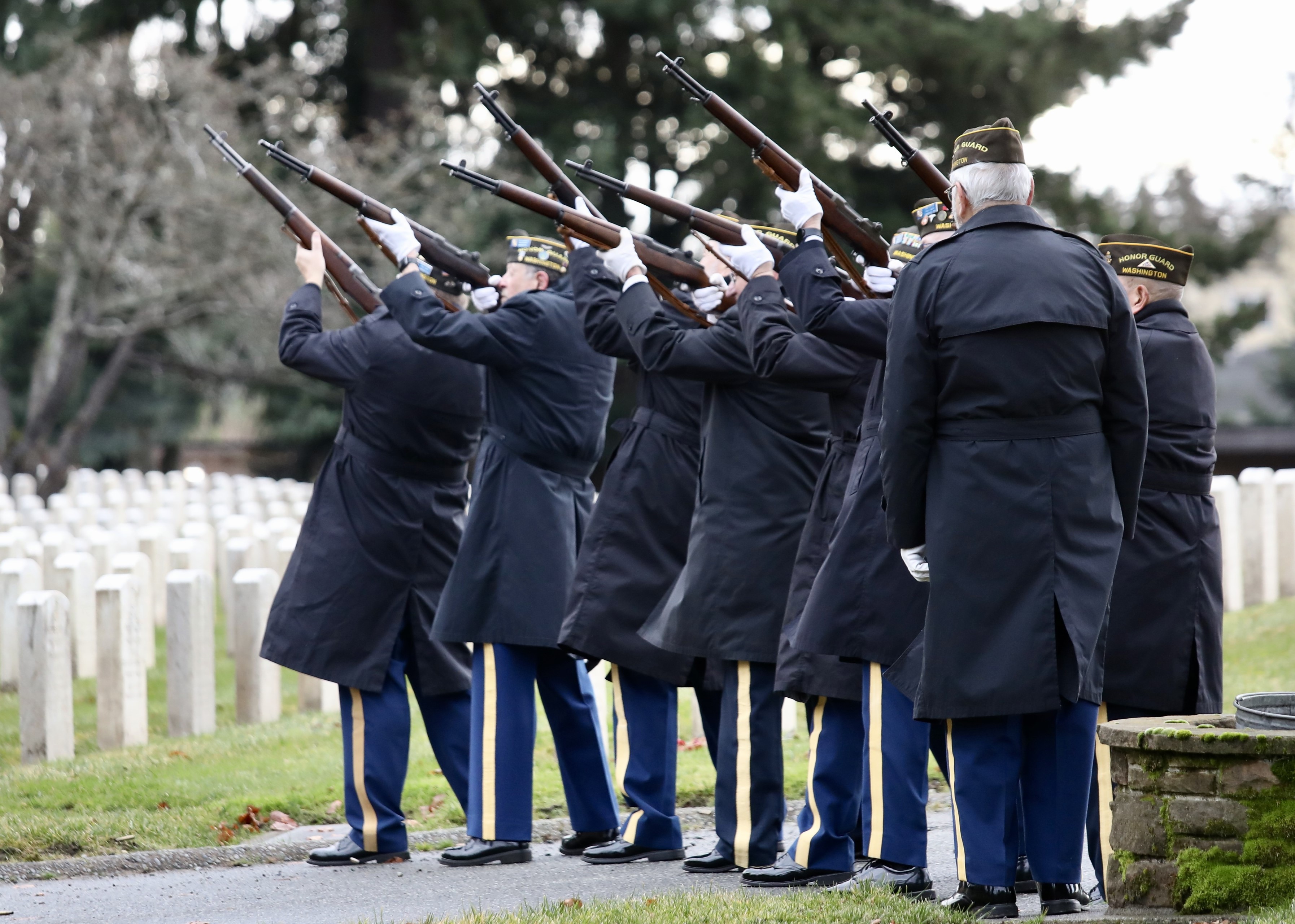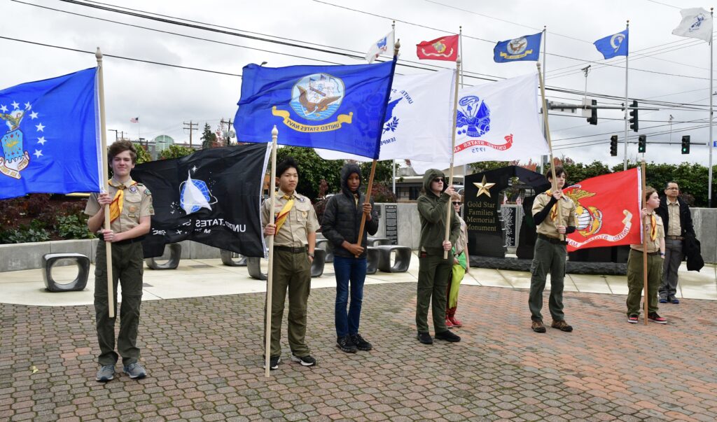My bugle call, “Assembly,” called the ceremony to order. The first major event, as always, was the placement of flags upon the 8 ceremonial wreaths by representatives of the Army, Marine Corps, Navy, Air Force, Space Force, Coast Guard, Merchant Marines and POWs/MIAs. (Read more about the POW/MIA representative below.) Then the Honor Guard of VFW Post 1040 of Lynnwood fired a 21-gun salute (3 volleys).