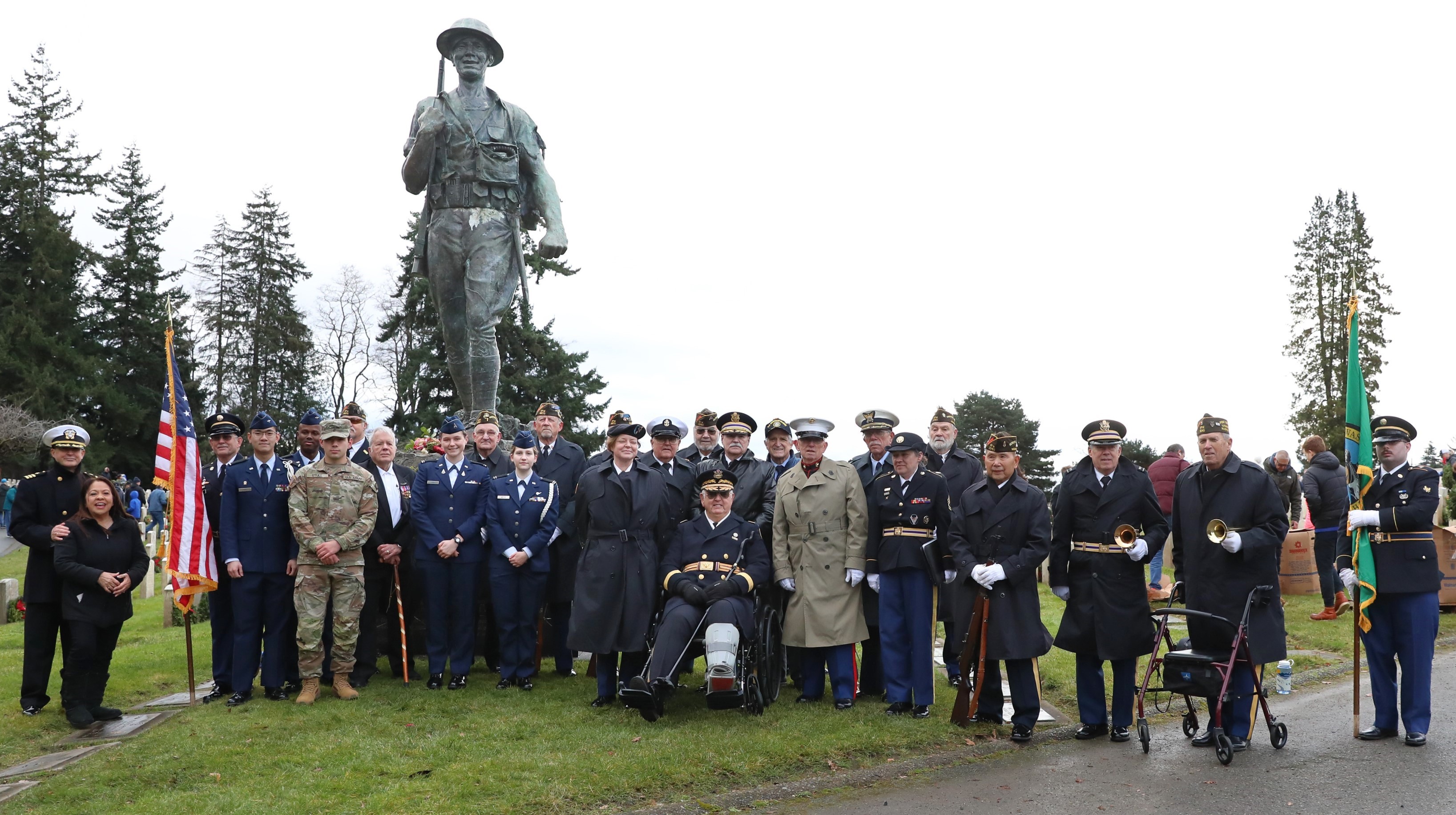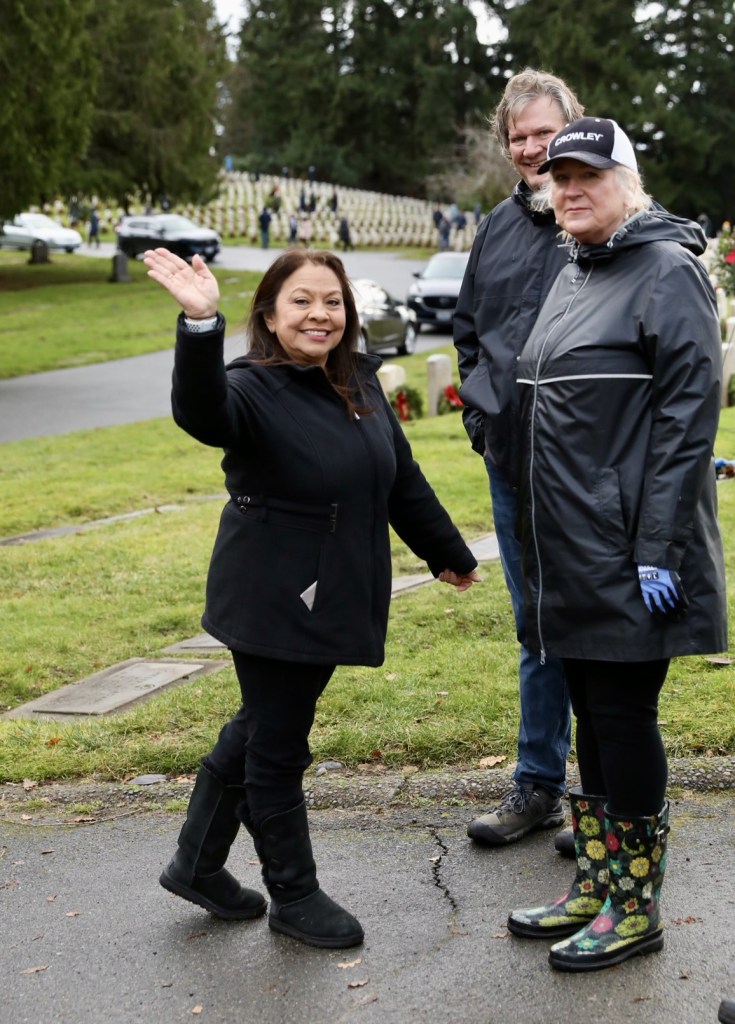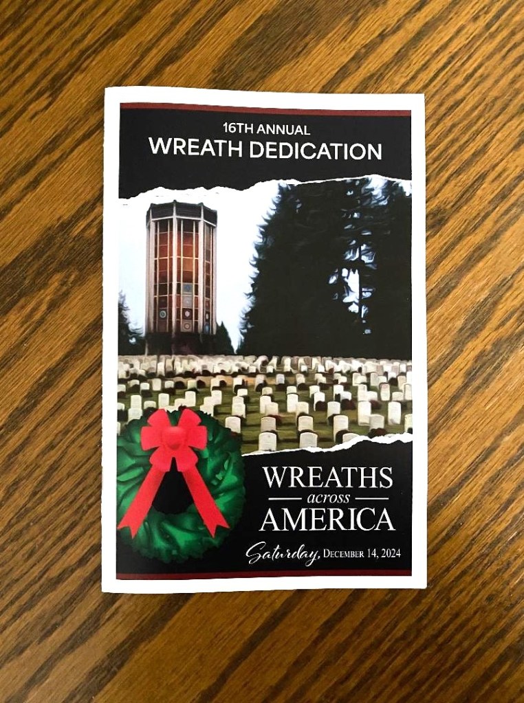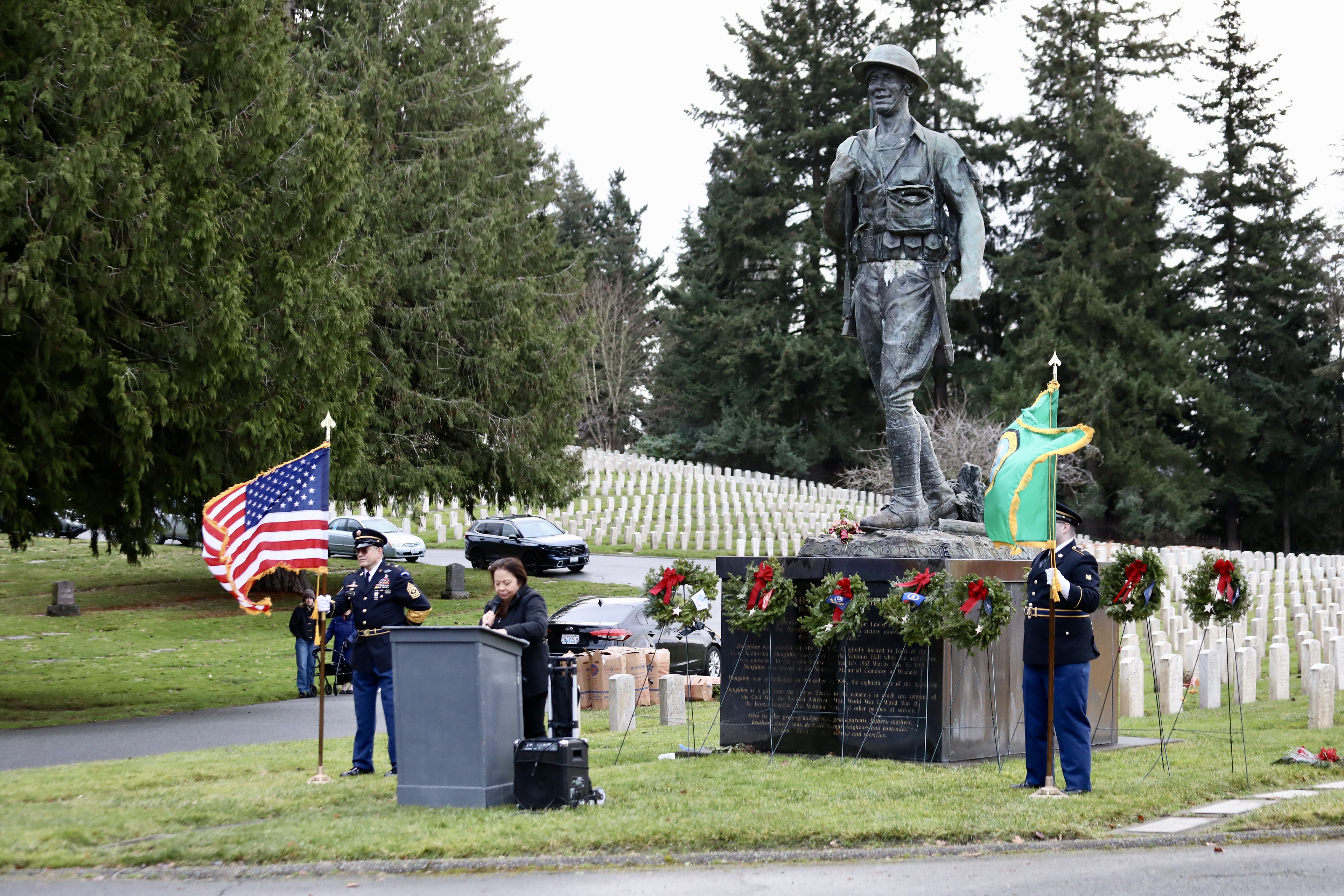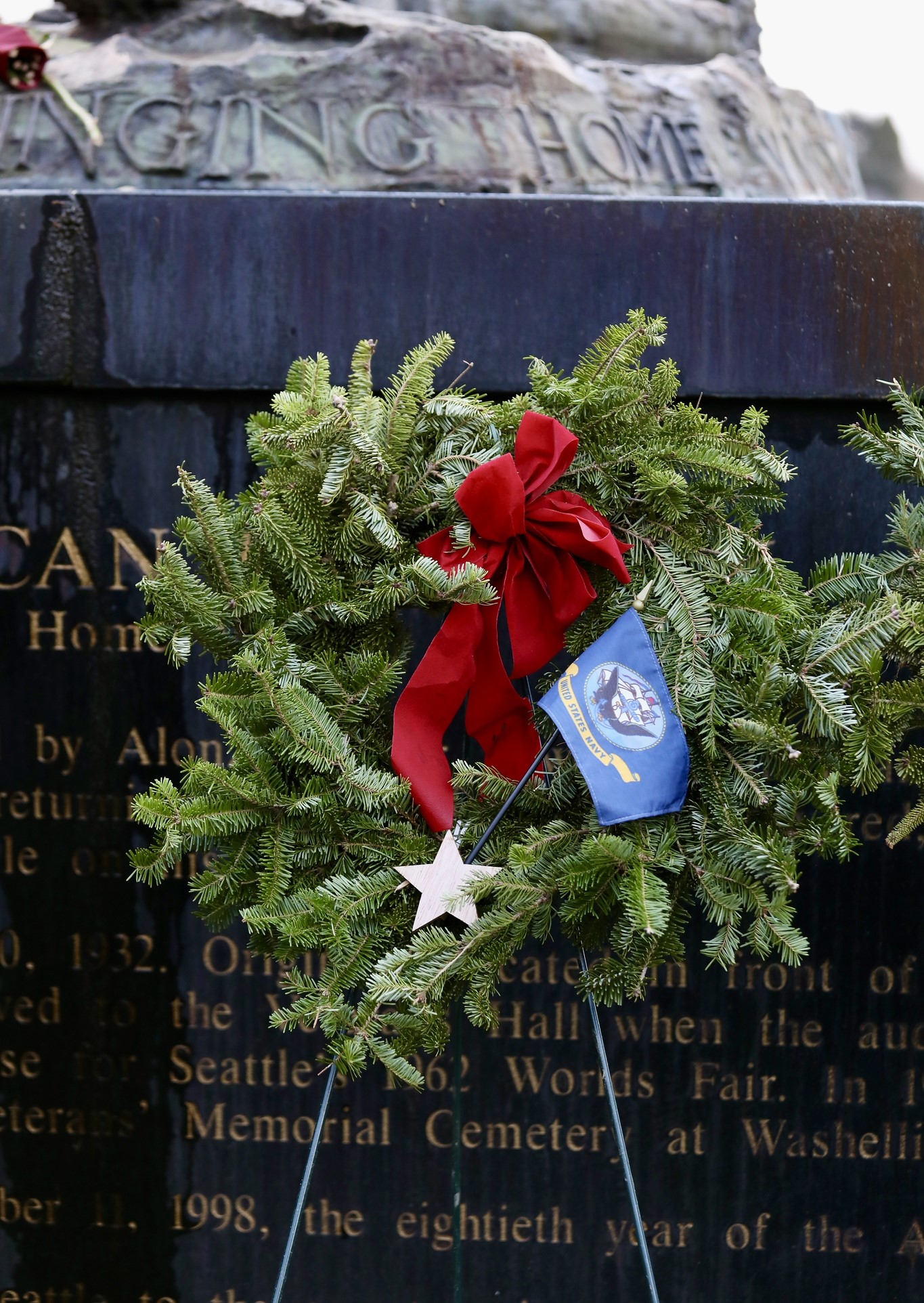 Despite the high, cold wind at 9 a.m. on Saturday, 14 December 2024, the participants and crowd gathered at the Doughboy statue in Veterans Memorial Cemetery at Evergreen-Washelli in north Seattle for the 16th annual Wreaths Across America (WAA) ceremony. The wind chill was so bad that the emcee, Lorraine Zimmerman, cut her own speech from the program. She is President and Executive Director of the Veterans Memorial Wreaths Foundation (WMWF—please see http://www.vmwf.org).