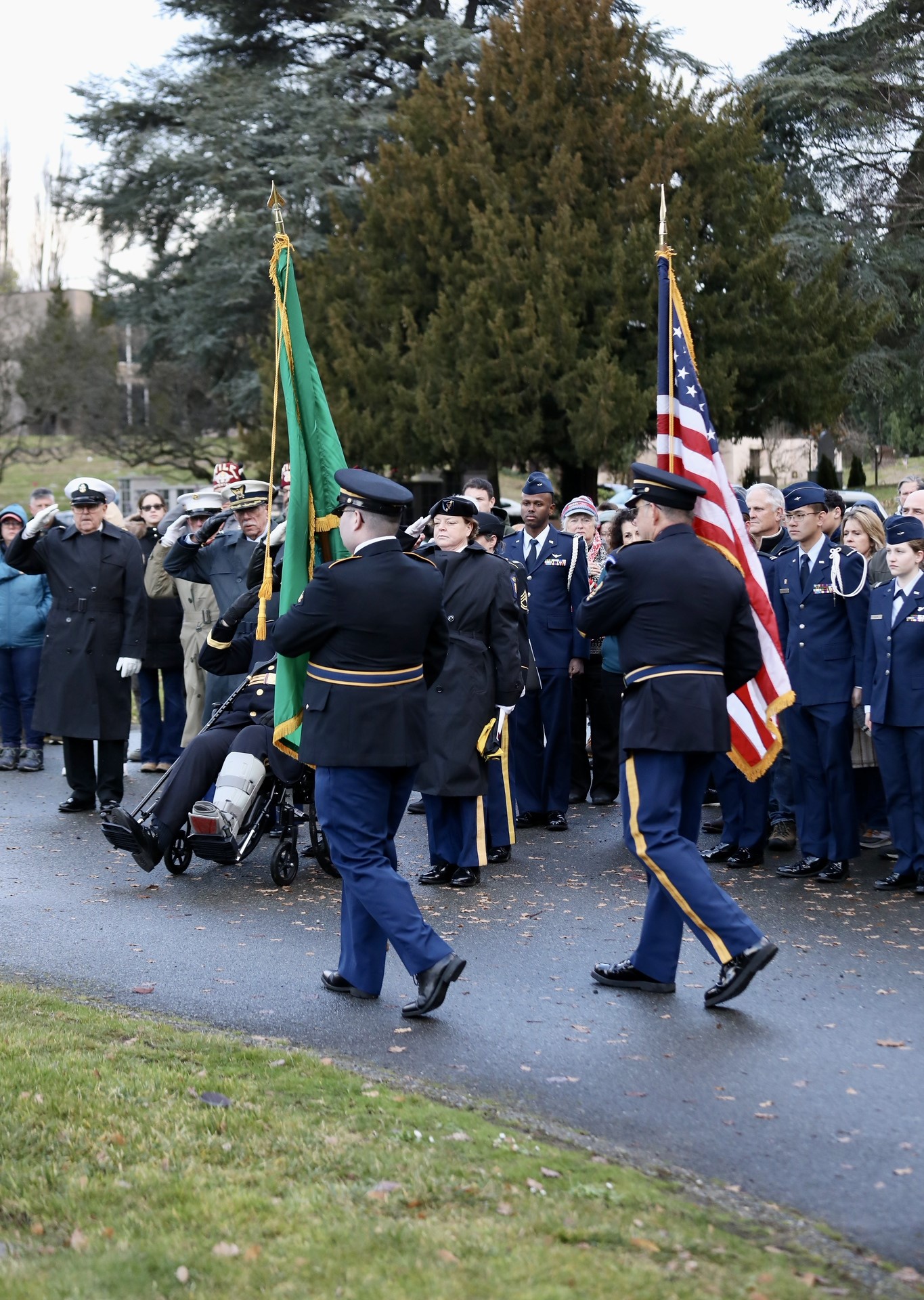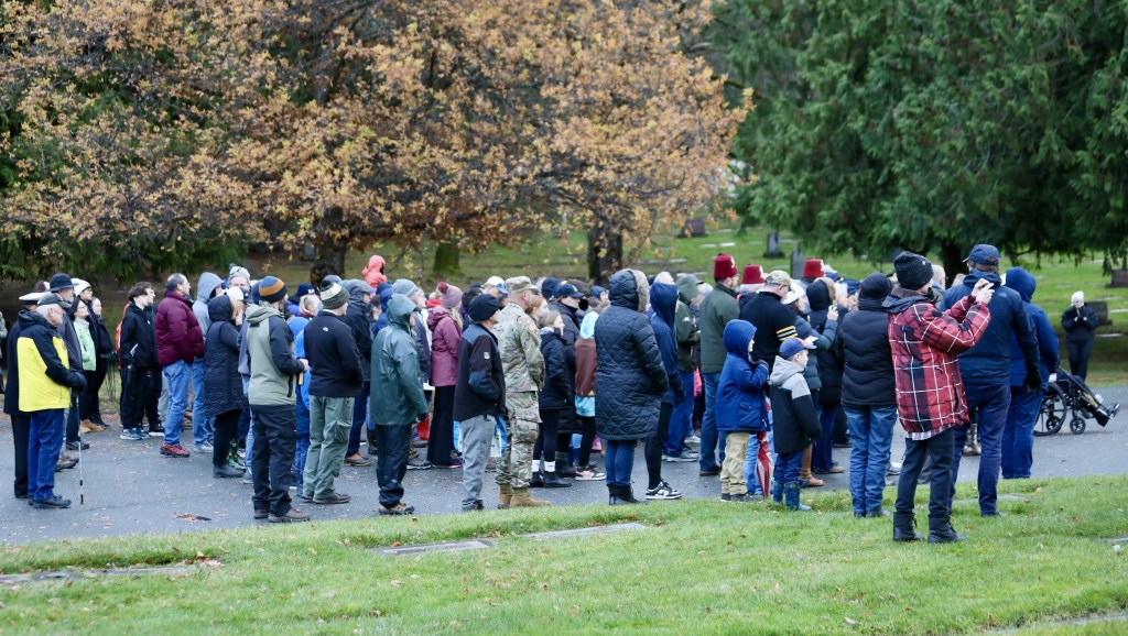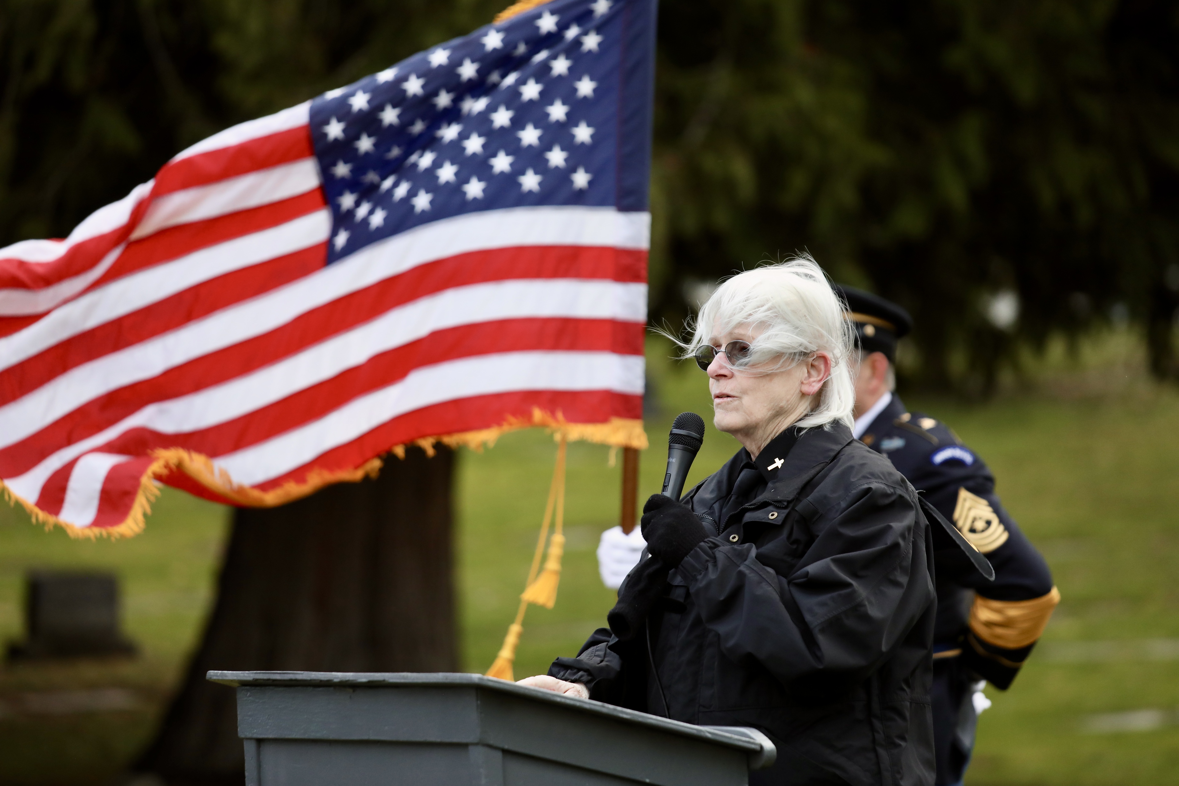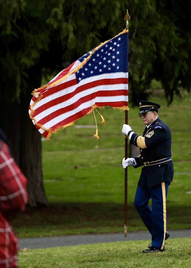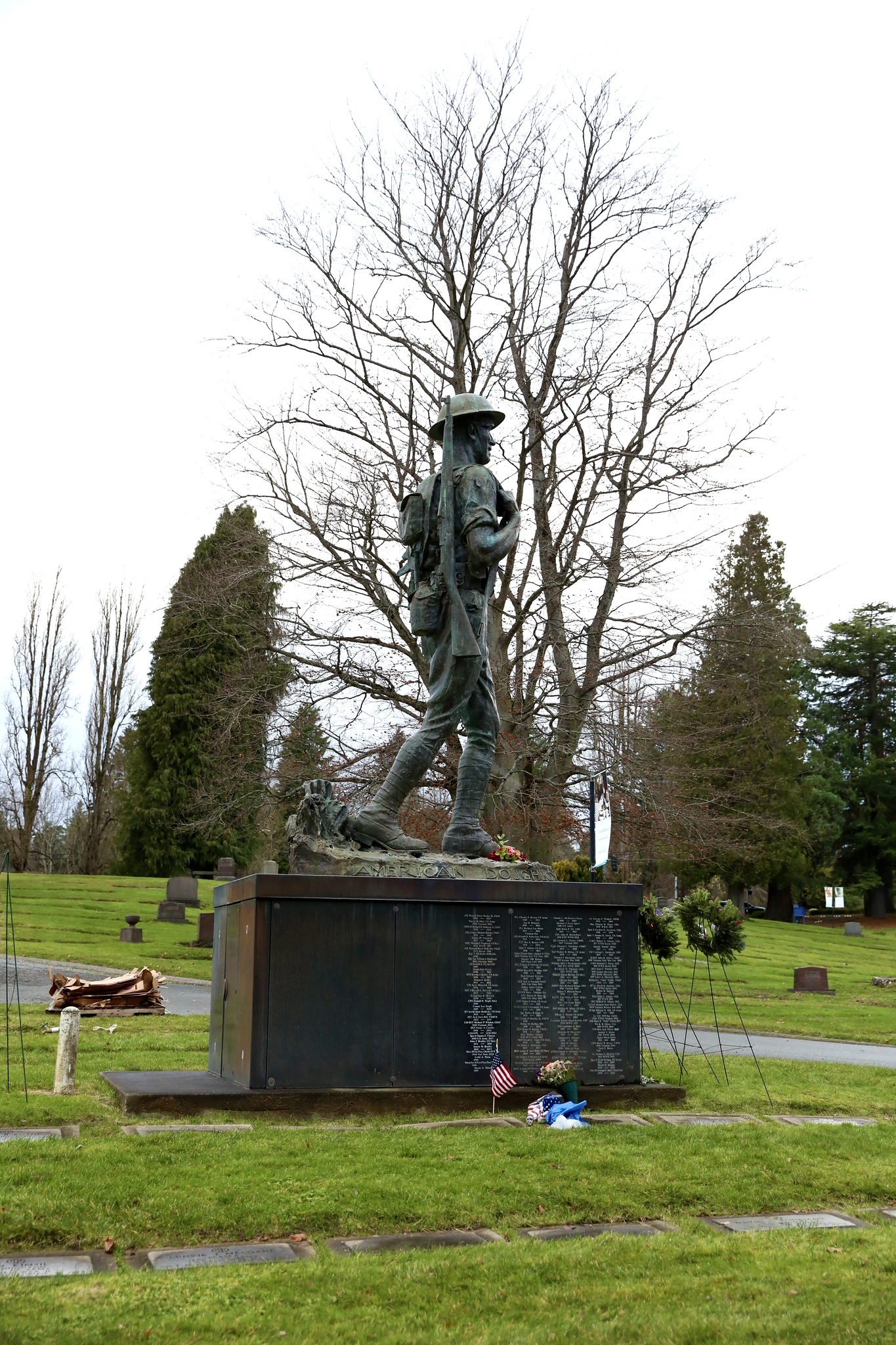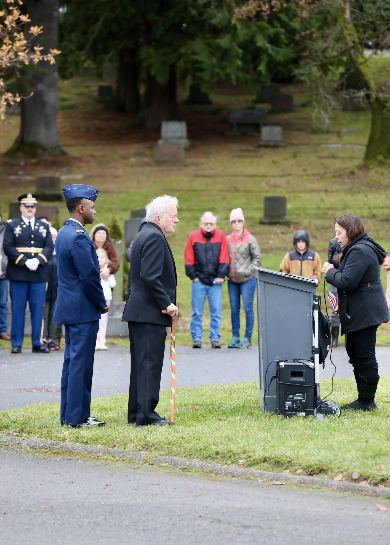 Despite the high, cold wind at 9 a.m. on Saturday, 14 December 2024, the participants and crowd gathered at the Doughboy statue in Veterans Memorial Cemetery at Evergreen-Washelli in north Seattle for the 16th annual Wreaths Across America (WAA) ceremony. The wind chill was so bad that the emcee, Lorraine Zimmerman, cut her own speech from the program. She is President and Executive Director of the Veterans Memorial Wreaths Foundation (WMWF—please see http://www.vmwf.org).