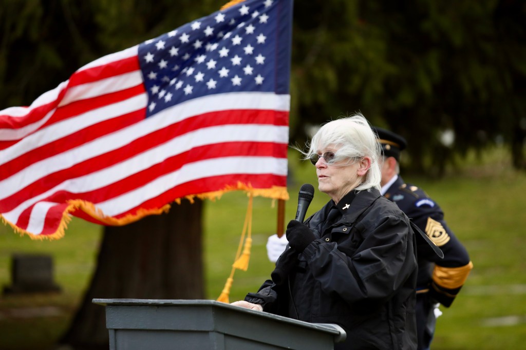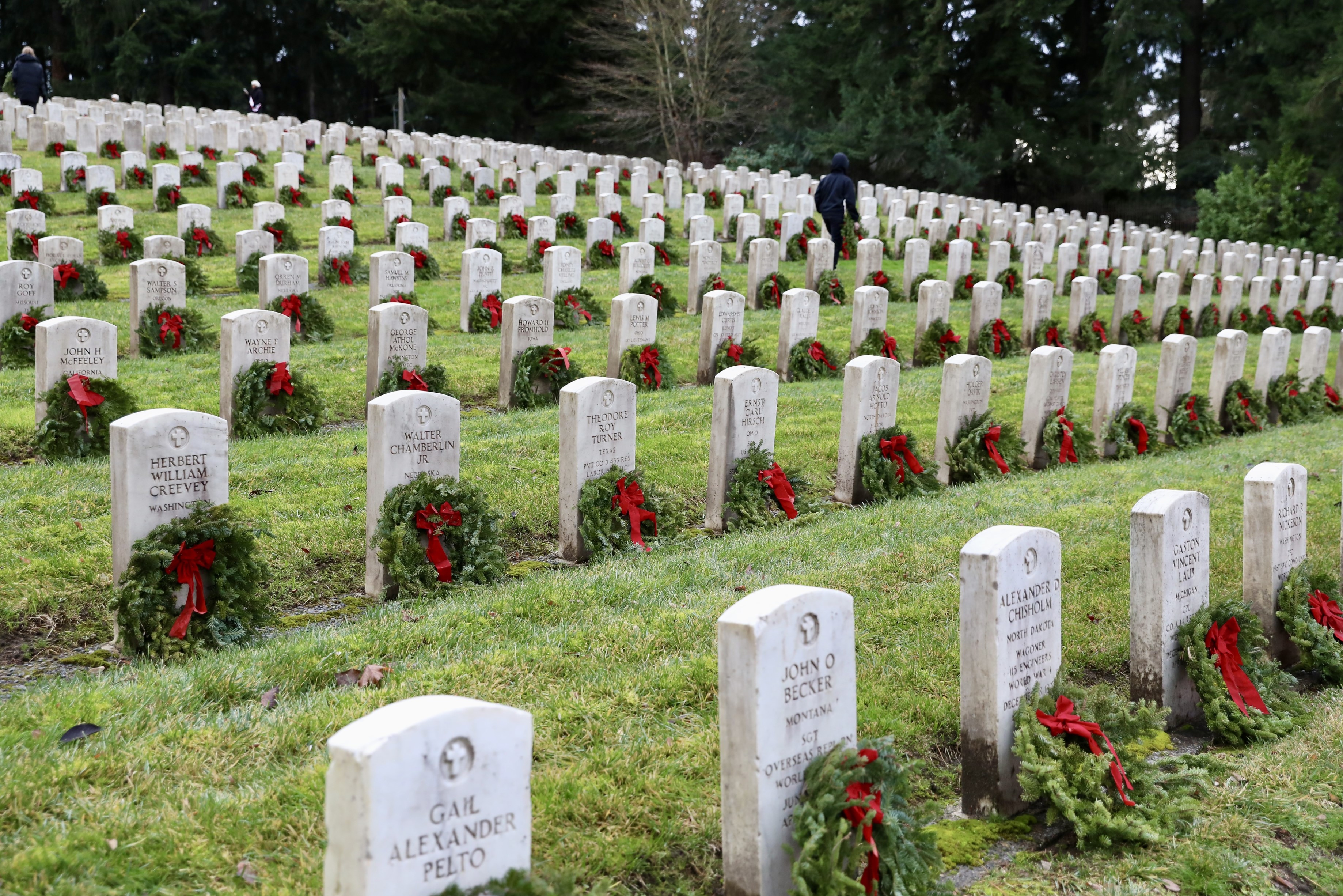 The second main event is the placement of wreaths against selected headstones among the more than 5,000 graves of veterans within Evergreen-Washelli. Seven Medal of Honor recipients are buried there. Zimmerman asked the wreath-laying volunteers to read aloud the names on the headstones as they placed the wreaths and thank them for their service—they are not forgotten.