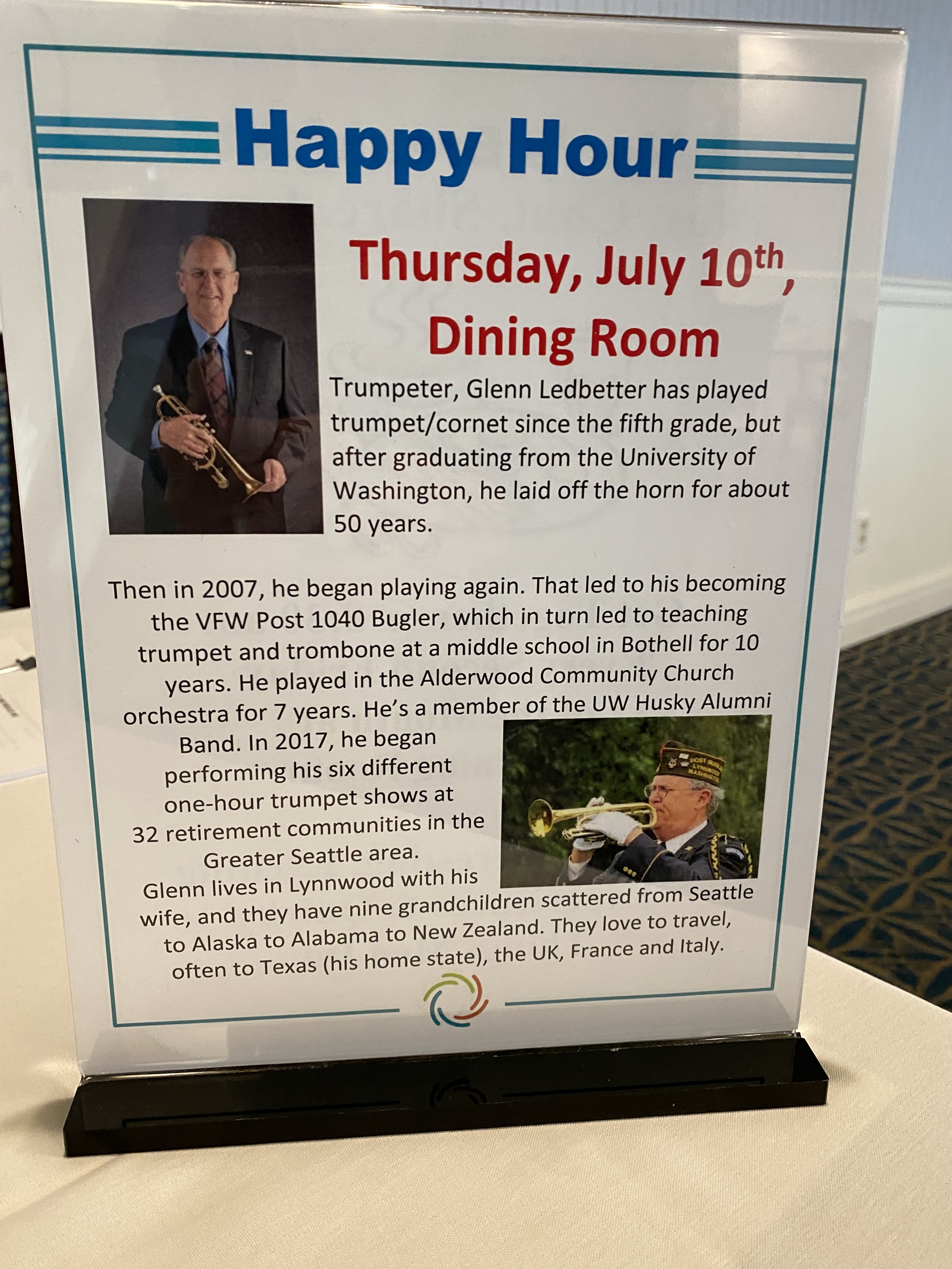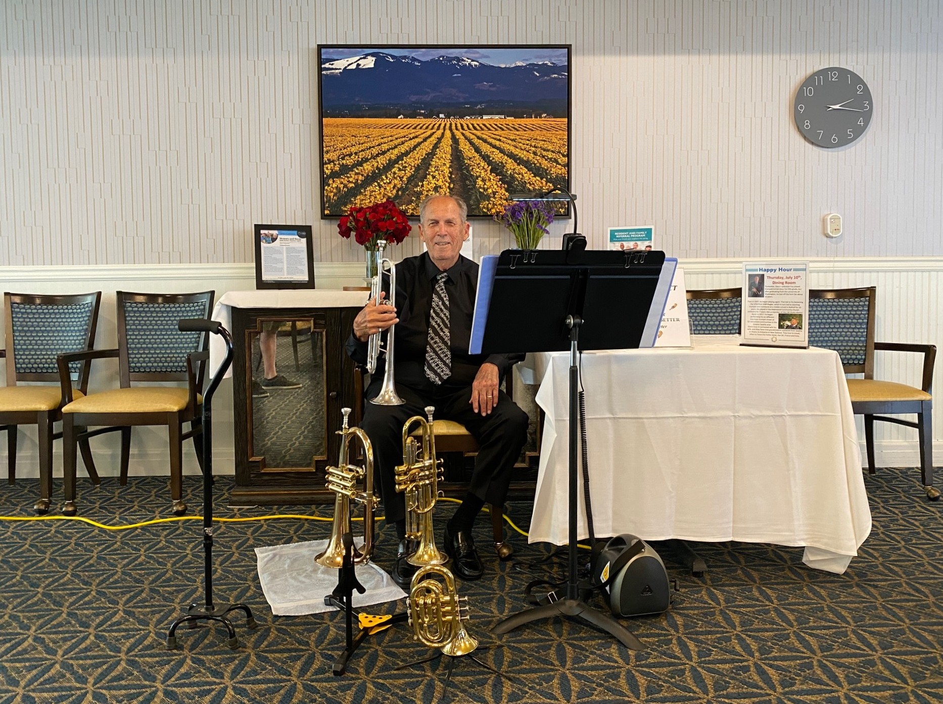 “Where Were You, Back Then?” is comprised of 15 hit songs that appeared in musicals, movies, and recordings during 1947-2008. I name the year and ask the audience members to remember their own lives during that year. Then I read some major events in the world that happened that year. Sometimes, I tell what was going on in my life. Then I play the song I’ve selected for that year. For example, 1956—Actress Grace Kelly marries Rainier III, Prince of Monaco—“I Whistle a Happy Tune” from the musical, The King and I. I used my trumpet, pocket trumpet, cornet and flugelhorn, sometimes with mutes. Meaningful fun!