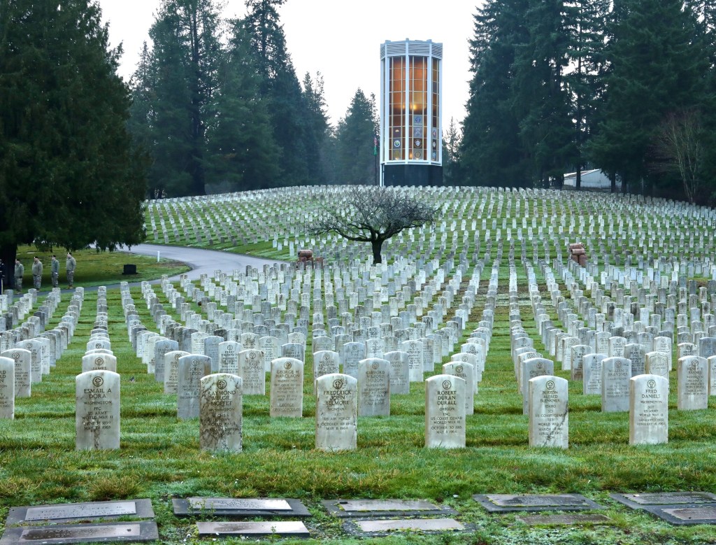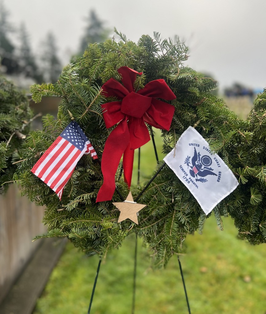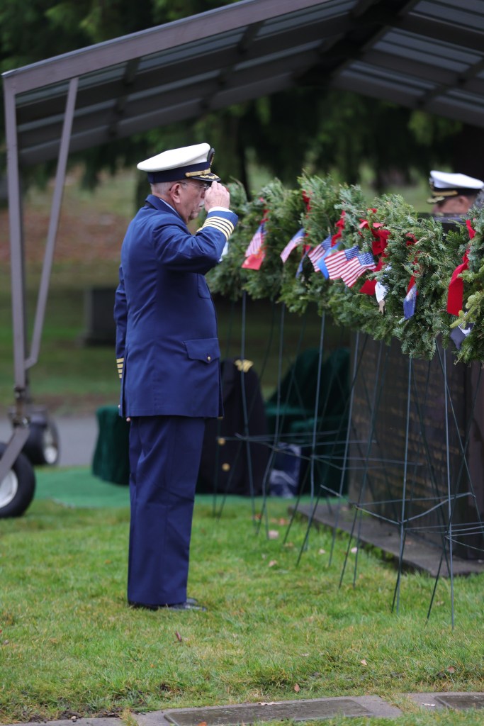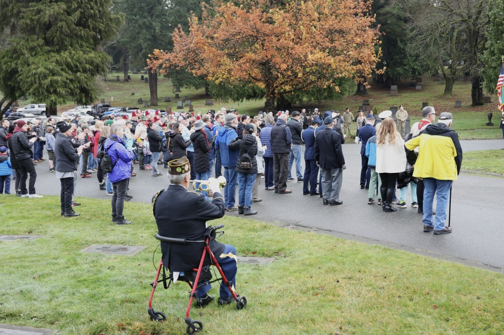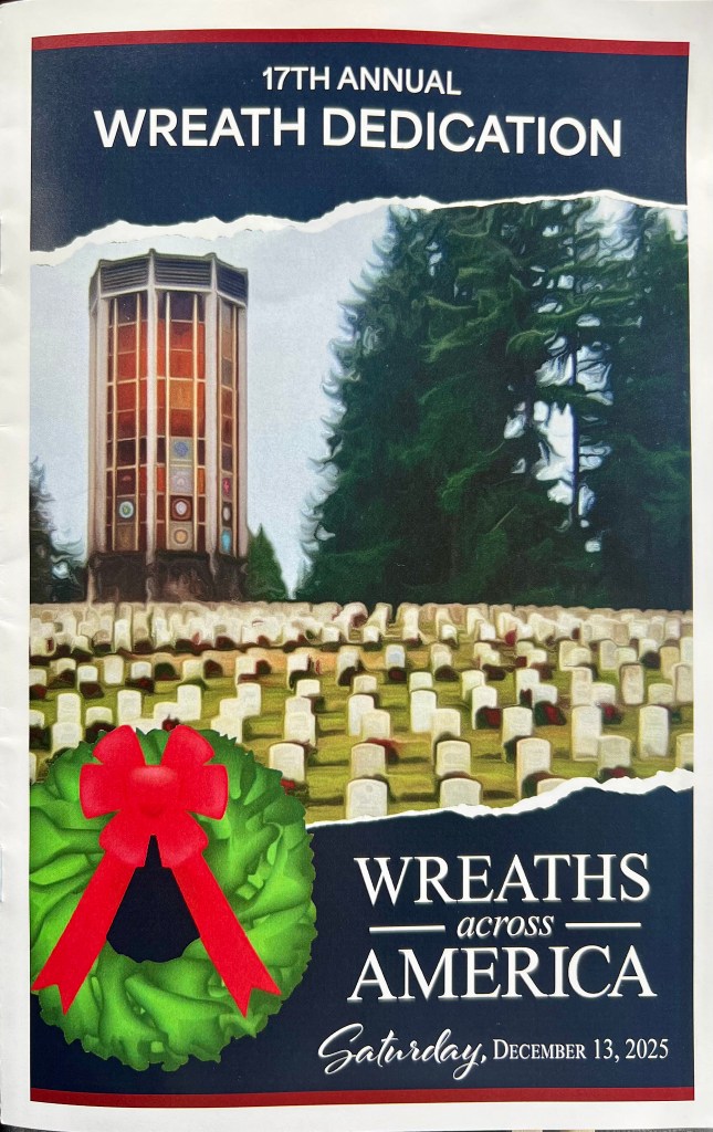 On Saturday, 13 December 2025, some 150 people gathered in north Seattle at Evergreen-Washelli’s Veterans Memorial Cemetery to honor the 5,000 veterans, including six Medal of Honor recipients, who rest in peace there. The Veterans Memorial Wreath Foundation (www.VMWF.org) sponsors the annual ceremony, its 17th. Jim Kellett and I sounded “Echo Taps” together for the second time, and that set me wondering about how many times I’ve performed at this event. So, I looked it up here on my blog (see Archives column to the left). My first was on 16 December 2011—a little personal history trivia. And I’ve posted articles here about almost all of them. They’re easy to find by using the search box in the upper right corner of this page.