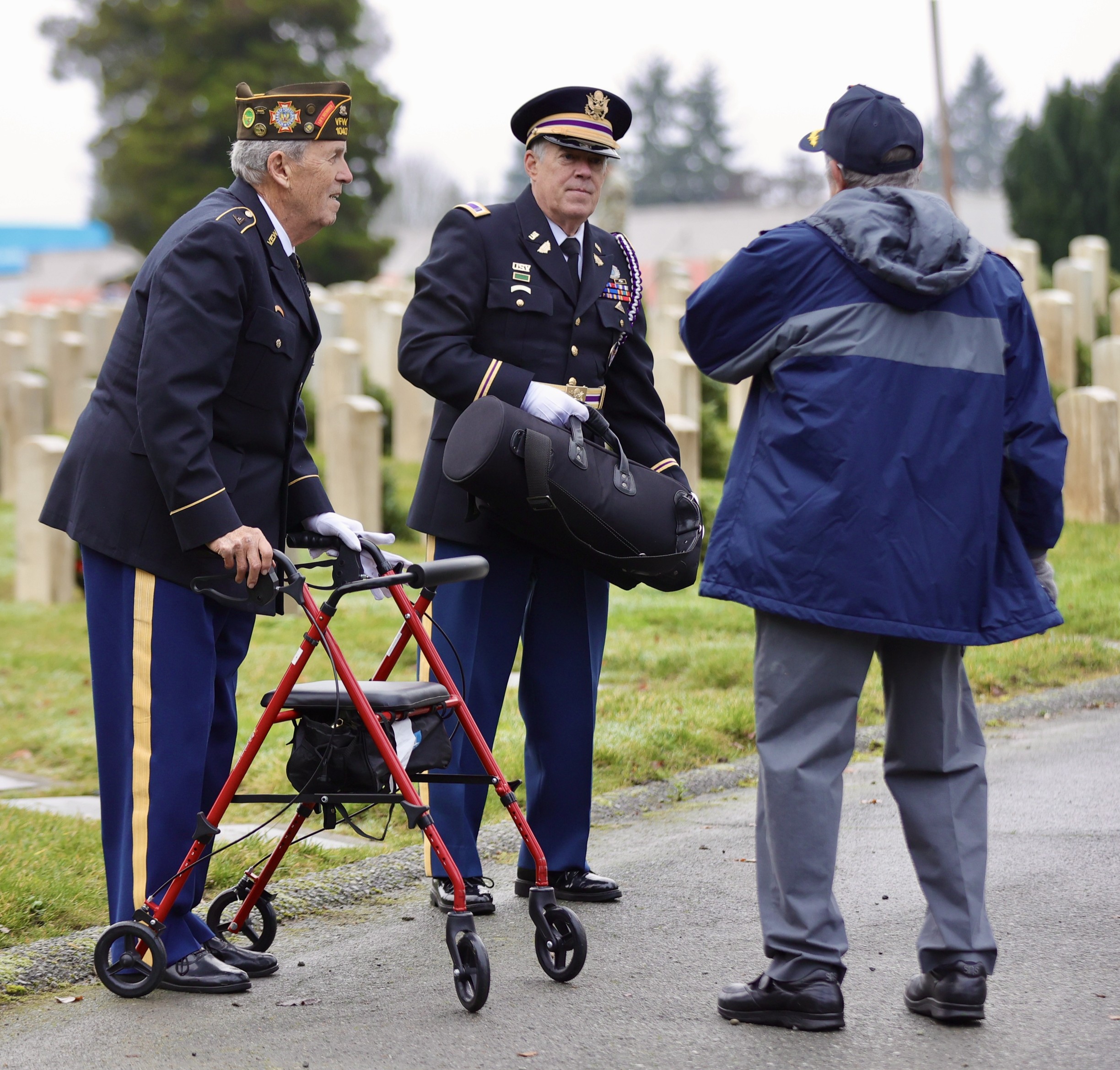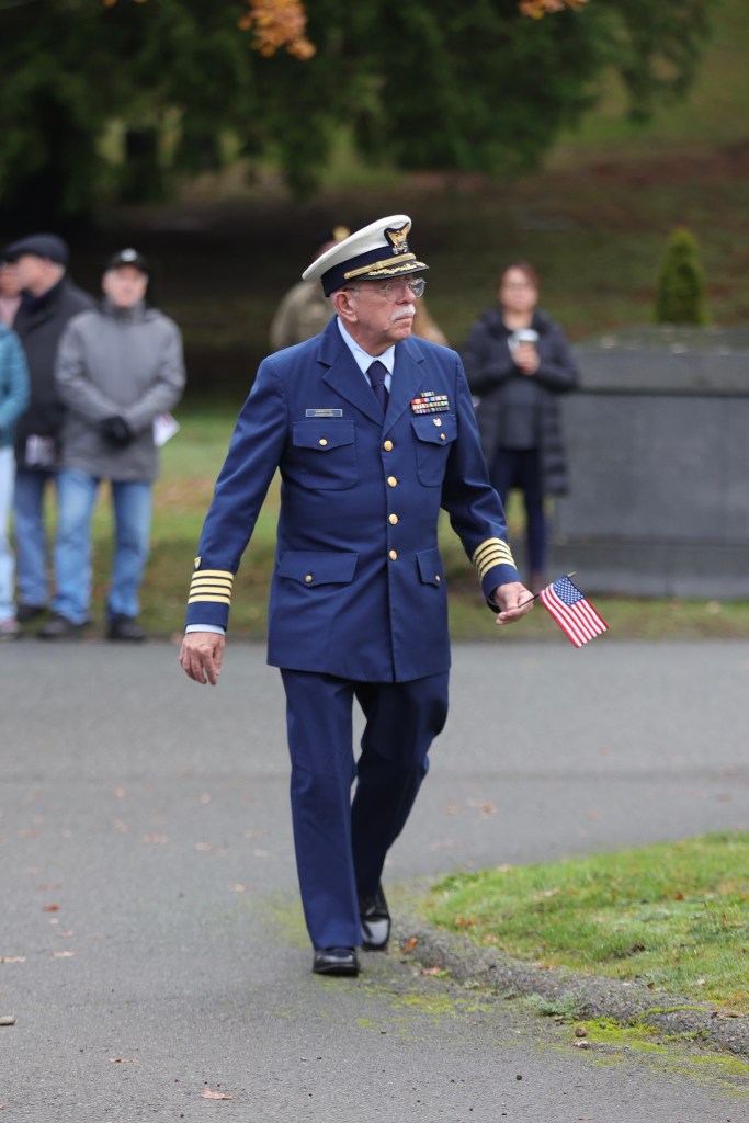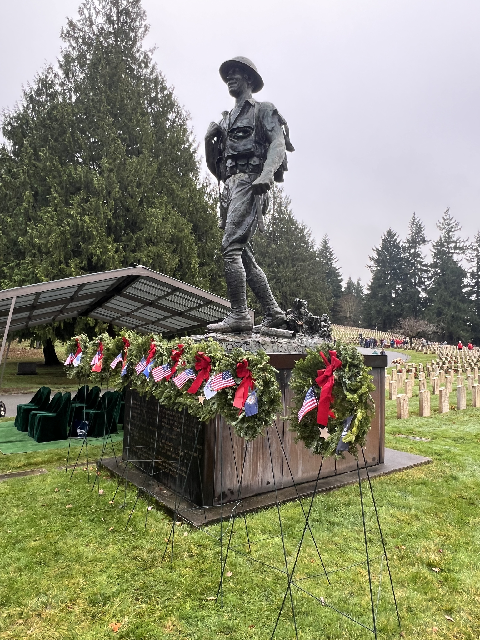 On Saturday, 13 December 2025, some 150 people gathered in north Seattle at Evergreen-Washelli’s Veterans Memorial Cemetery to honor the 5,000 veterans, including six Medal of Honor recipients, who rest in peace there. The Veterans Memorial Wreath Foundation (www.VMWF.org) sponsors the annual ceremony, its 17th. Jim Kellett and I sounded “Echo Taps” together for the second time, and that set me wondering about how many times I’ve performed at this event. So, I looked it up here on my blog (see Archives column to the left). My first was on 16 December 2011—a little personal history trivia. And I’ve posted articles here about almost all of them. They’re easy to find by using the search box in the upper right corner of this page.
