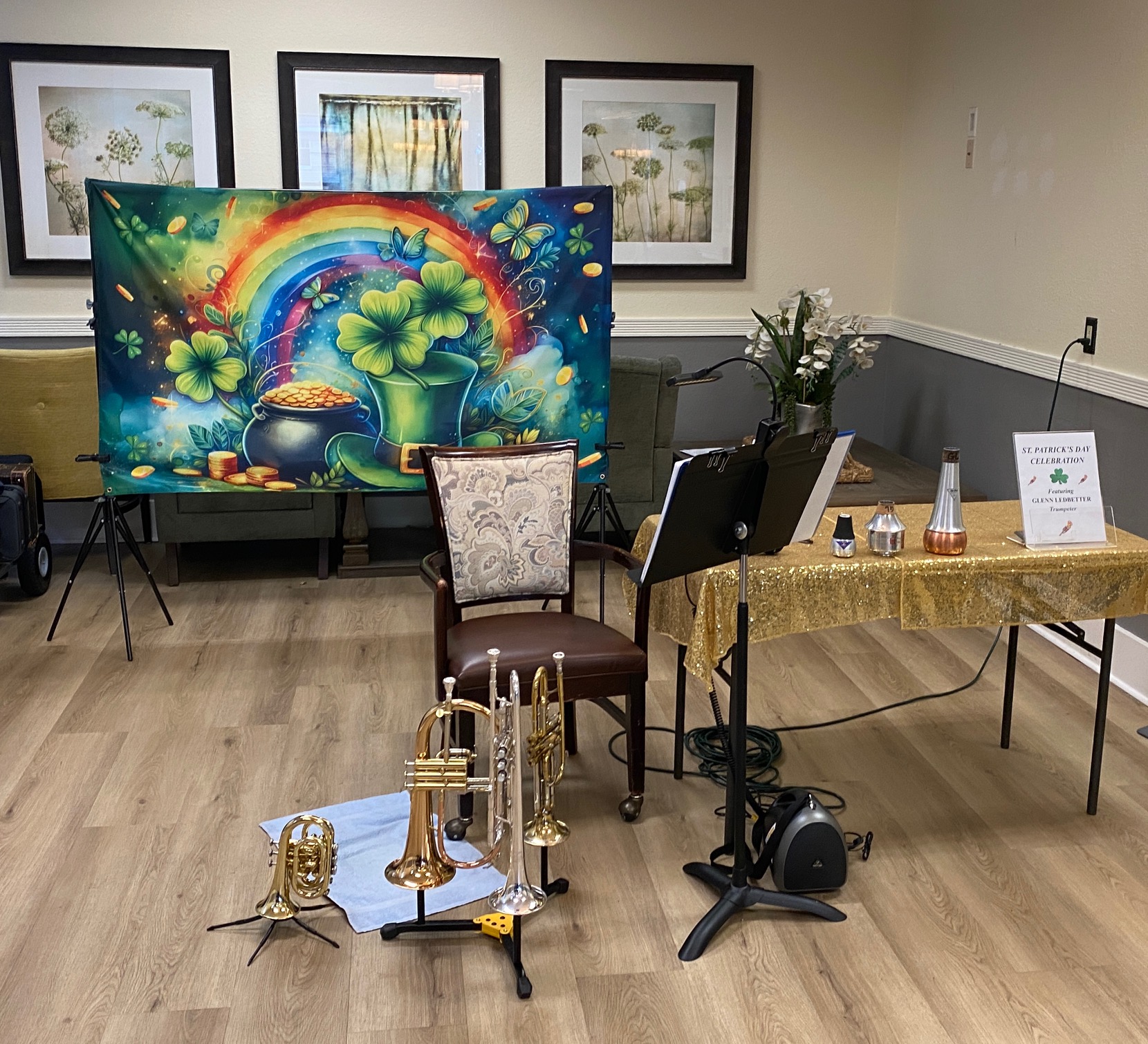 We stretched our recognition of St. Patrick’s Day by one day, 18 March, so that I could perform my trumpet show, “St. Patrick’s Day Celebration,” at Queen Anne Manor in Seattle. It was the 41st retirement community in the Greater Seattle area where I’ve performed since I began doing this 8 years ago.