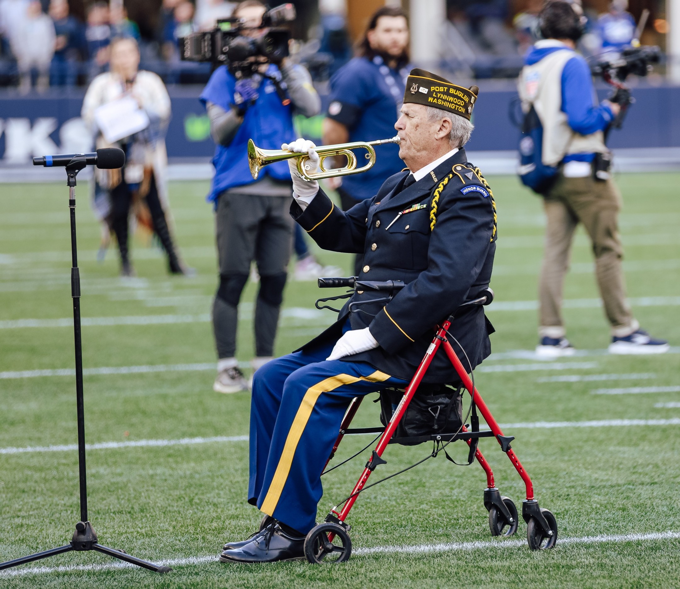 So, three huge dominoes fell in succession—in 2023, 2024, 2025. Then, last July, Glenn sent an email to the Seahawks, volunteering to sound “Taps” at the game on 9 November, two days before Veterans Day. They agreed to consider it. In early October, he wrote again and was told it was unlikely. Then, on 30 October, he got an email from the Seahawks: “Sorry for the late ask but any chance you’re available to play Taps for us during our Salute to Service halftime ceremony next Sunday (11/9)?” He immediately replied, “Yes, I’m thrilled to accept your invitation!” The next day, Halloween, the Seahawks sent another invitation: could he play “Taps” pre-game in the Ticketmaster Tailgate area at 11:45? Yes, of course. And he dropped practically everything else.