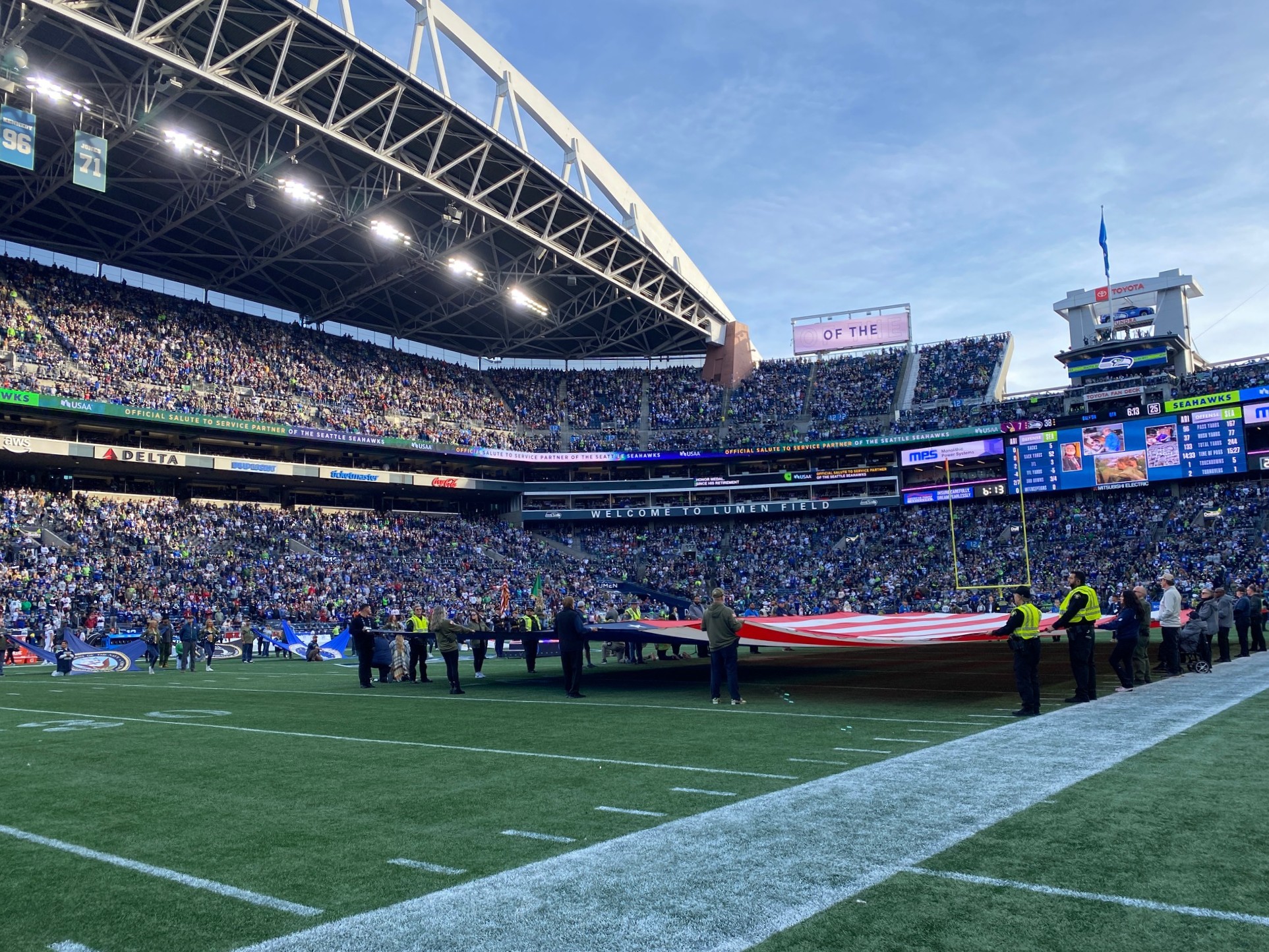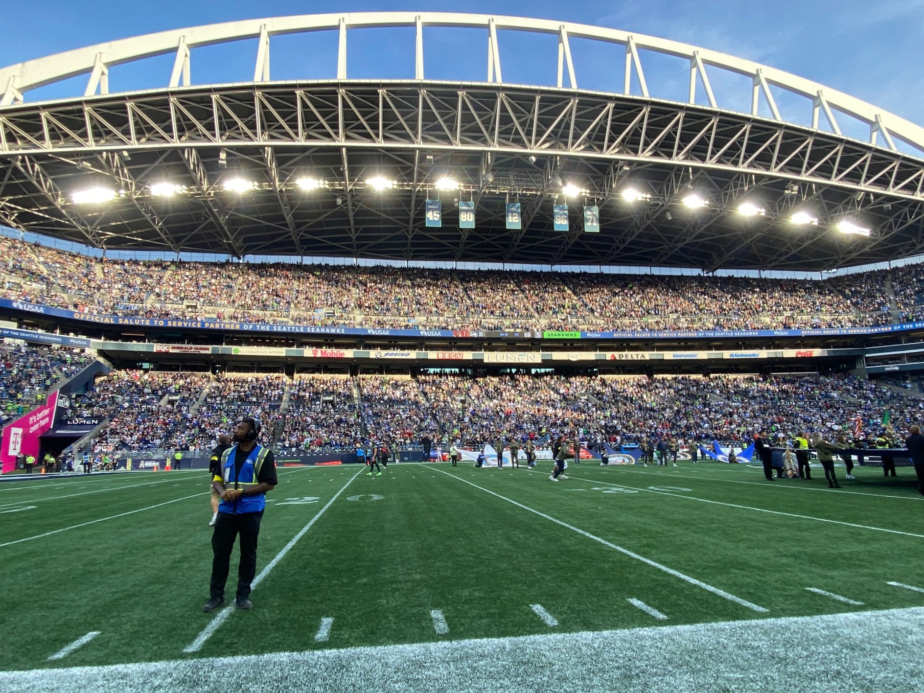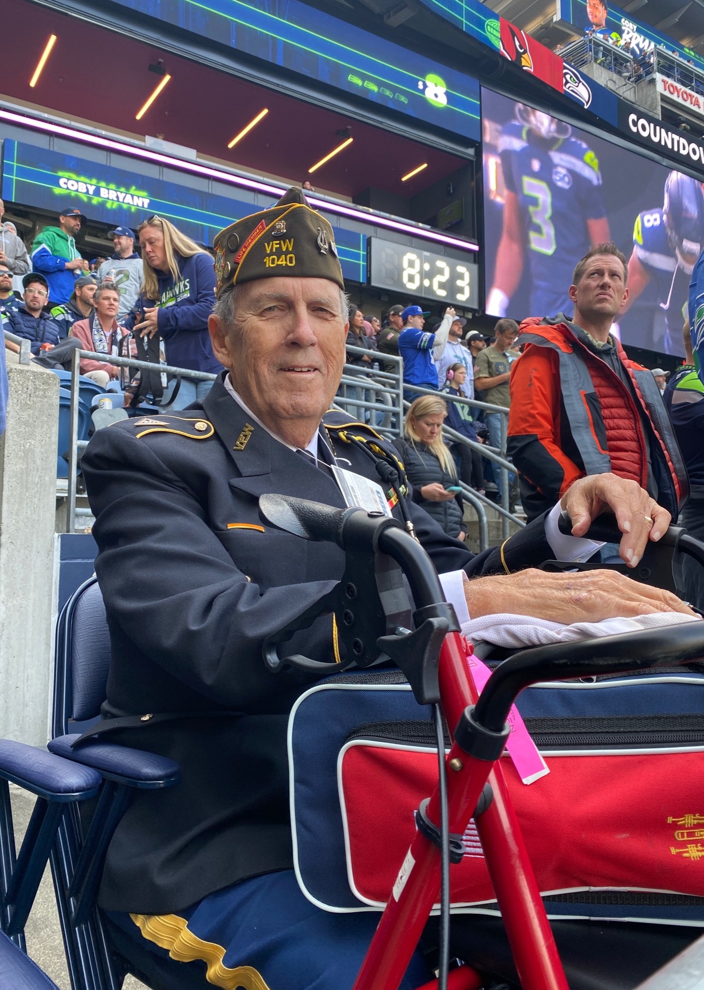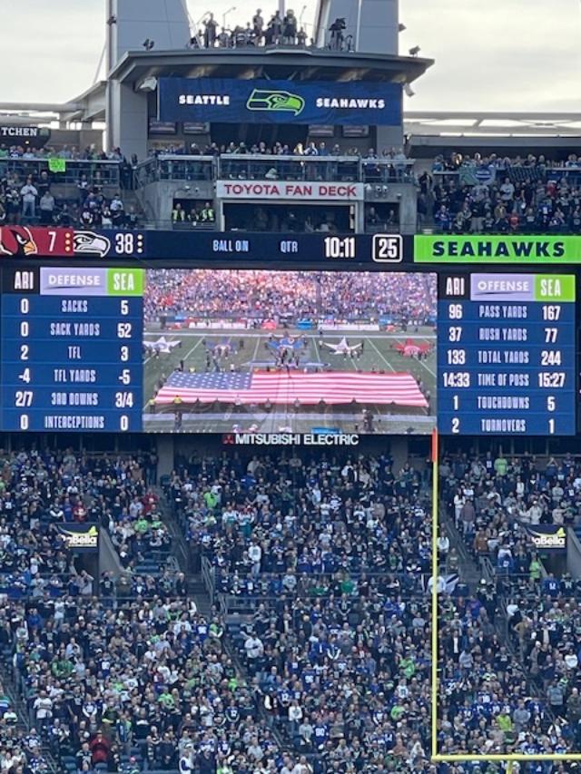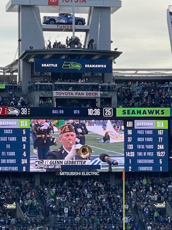 Here he was on the 50-yard line of Lumen Field during the game between the Seattle Seahawks and Arizona Cardinals—a dream come true! And only a year and a half ago, he had sounded “Taps” at a baseball game at T-Mobile Stadium between the Seattle Mariners and the Houston Astros—the first such dream to come true! The Seahawks dream grew out of the Mariners dream.