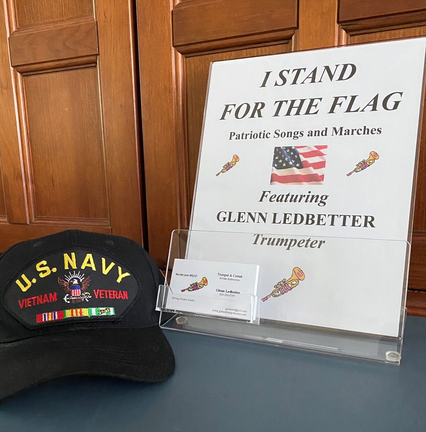 On 21 May, I gave my first performance of my trumpet show, “I Stand for the Flag,” a collection of 25 patriotic marches, songs, a bugle call, and a hymn. The venue was Ida Culver House, Broadview, a retirement community in north Seattle. For one hour, I entertained the residents with pieces such as “Semper Fidelis,” “When Johnny Comes Marching Home Again,” “Over There,” “Shenandoah,” “Eternal Father, Strong to Save” (The Navy Hymn), “God Bless America,” “America the Beautiful,” and “You’re a Grand Old Flag.”