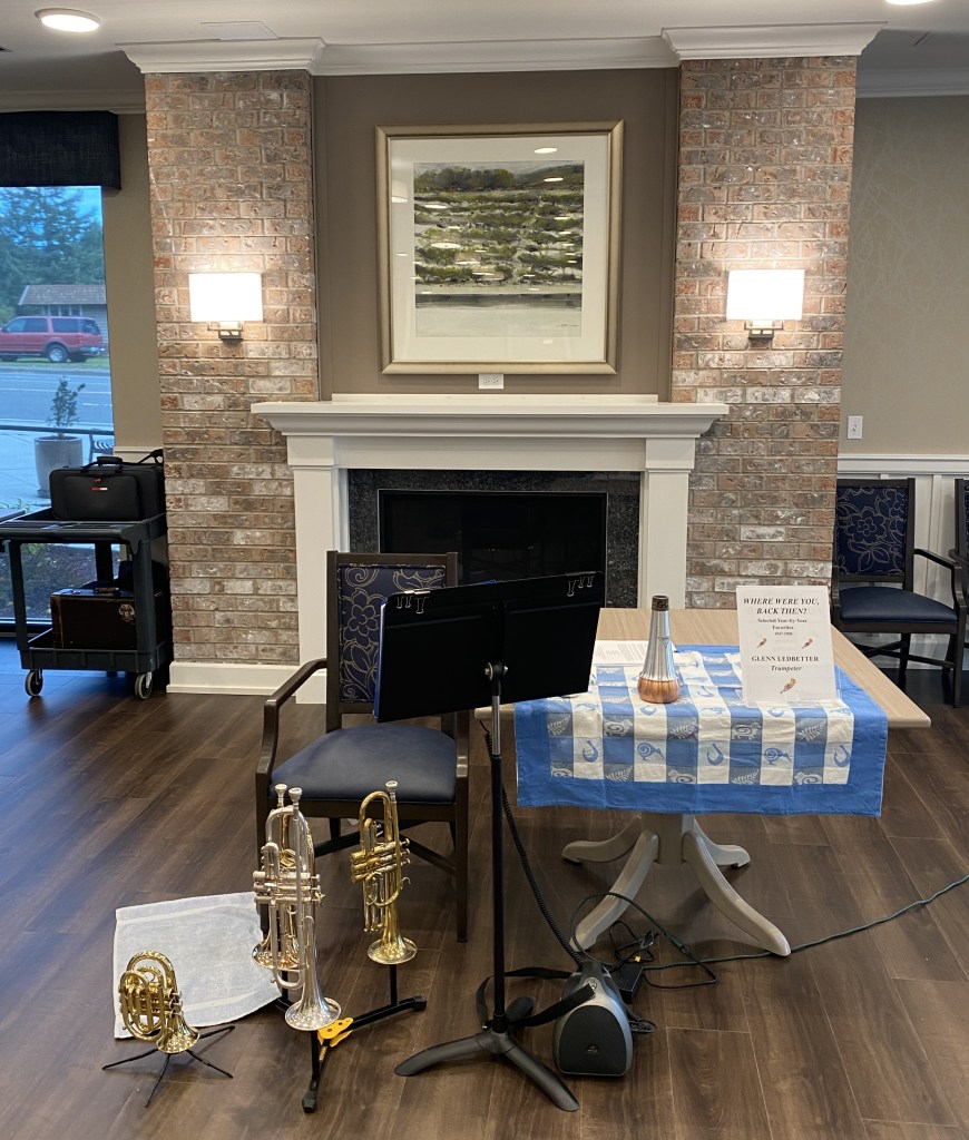 Vineyard Park at North Creek (VPNC) in Bothell just opened last January, and it’s now the 36th retirement community where I have performed one of my six one-hour trumpet shows. It was my first appearance there (on 8 November), and the show was “Where were you, Back Then?” This new place is lovely. As I played before the fireplace in the large dining room, the crowd grew, as it often does when people begin to hear tunes they remember well and like.