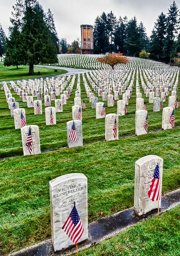 Picture 5,000 white marble markers on the graves of veterans interred at Veterans’ Memorial Cemetery in north Seattle on the grounds of the larger Evergreen Washelli Cemetery. Imagine at least 700 people gathered there for the 85th Annual Memorial Day Celebration. That’s what happened Monday, 30 May. “Ya shoulda been there”–such sights to see and sounds to hear! I especially enjoyed the prominent role of music in the celebration.