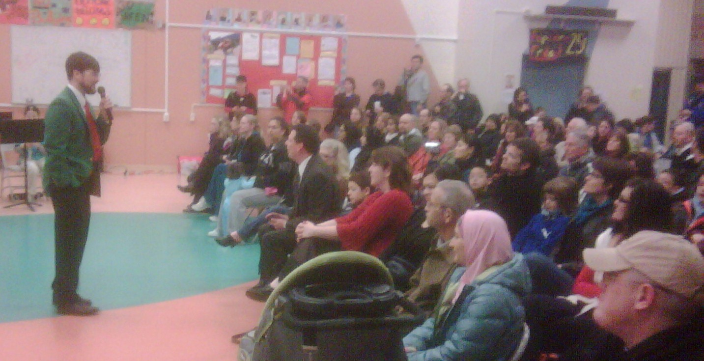 Early last Wednesday, about 150 parents and relatives swarmed into the cafeteria at Skyview Jr. High (SJH) in Bothell, WA, to see and hear their kids play in the winter concert by the two elementary bands conducted by Mr. Shawn McGinn. It was a standing room only crowd! The 1st-year and 2nd-year bands are comprised of about 85 students in the 5th and 6th grades from three elementary schools which feed into SJH: Crystal Springs, Canyon Park, and Fernwood. As you know, I’m Mr. McGinn’s assistant for brass instruction with both these bands (see my post on 6 September 2010).